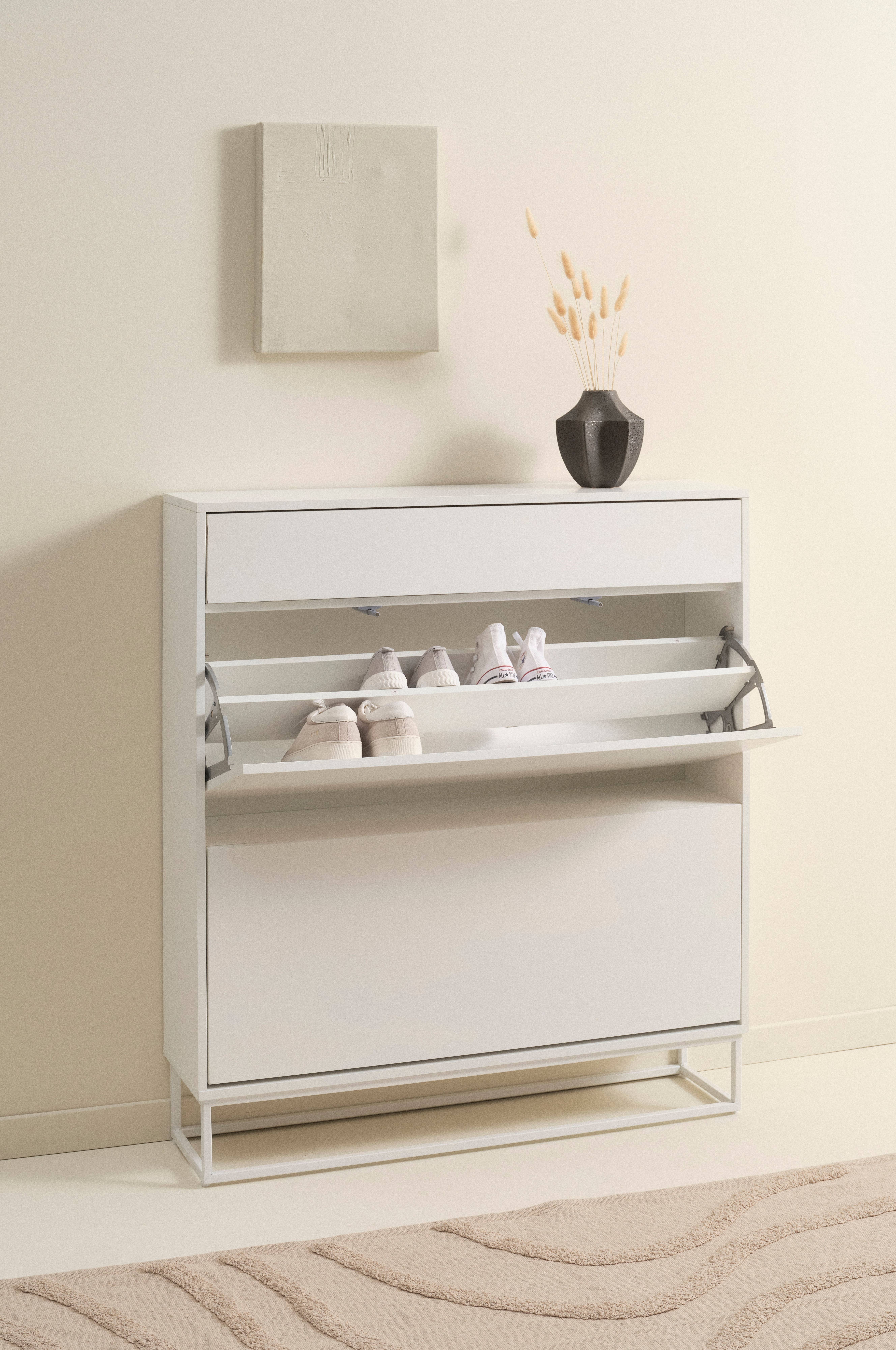 Szafka na buty z płyty MDF i stelażem wykonanym z metalu. Ta surowa w swojej formie i stylowa szafka posiada dwie szuflady, w których buty leżą pod kątem. Szuflady wyposażone są w mechanizm push to open. Górna szuflada zapewni praktyczne przechowywanie. Przód szafki jest całkowicie gładki i mimo braku uchwytów łatwo się otwiera. Buty w szufladach ustawione są pionowo, dzięki czemu szafka jest wąska i nie zajmuje w przedpokoju dużo miejsca. Części wykonane z płyty MDF zostały pokryte lakierem na bazie wody. Prostokątna podstawa jest lakierowana proszkowo. Dzięki mocowaniom szafa może zostać przymocowana do ściany, jeśli zajdzie taka potrzeba. Wymaga częściowego montażu. Do produktu dołączona jest instrukcja montażu.
