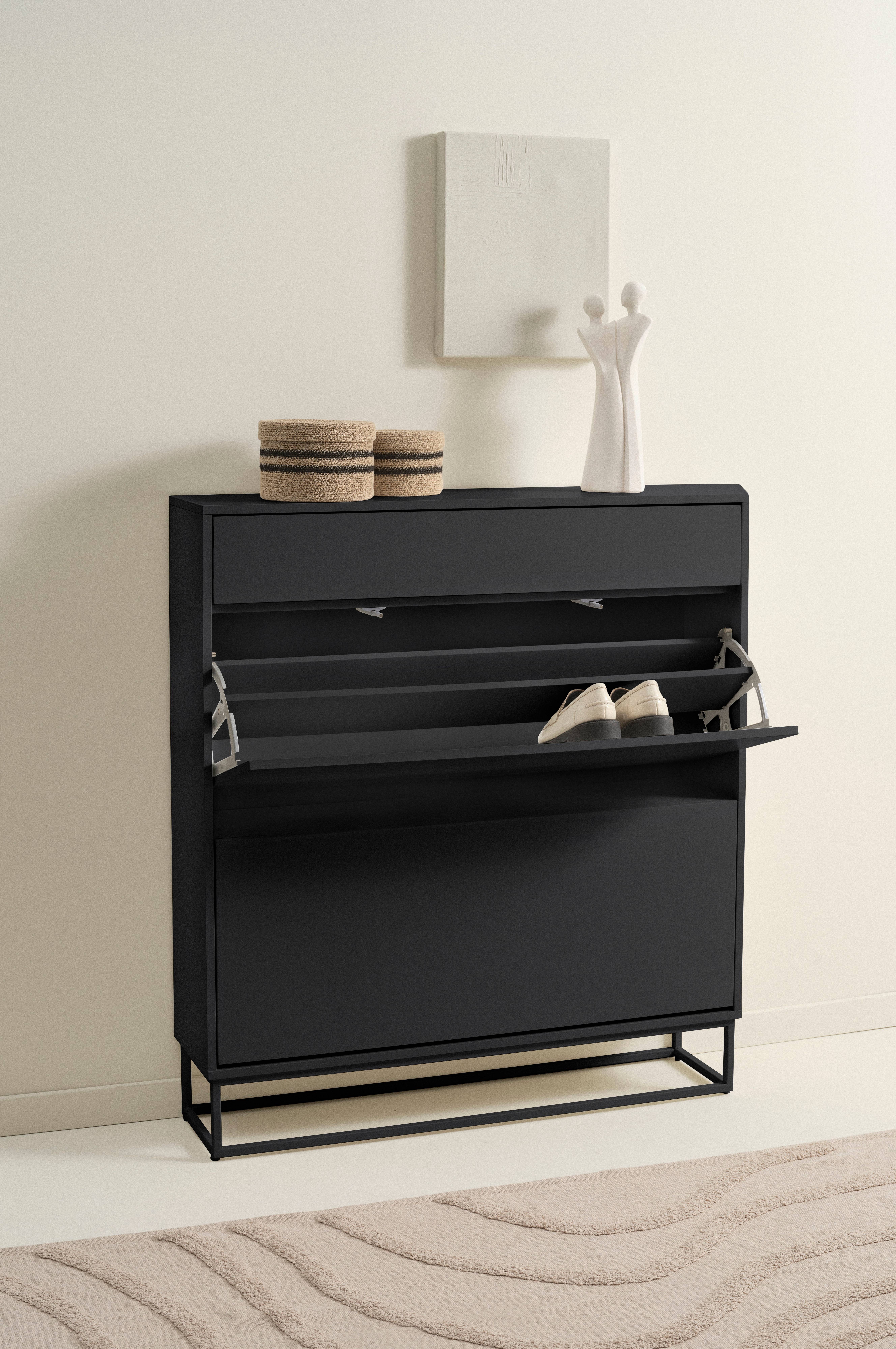 Szafka na buty z płyty MDF i stelażem wykonanym z metalu. Ta surowa w swojej formie i stylowa szafka posiada dwie szuflady, w których buty leżą pod kątem. Szuflady wyposażone są w mechanizm push to open. Górna szuflada zapewni praktyczne przechowywanie. Przód szafki jest całkowicie gładki i mimo braku uchwytów łatwo się otwiera. Buty w szufladach ustawione są pionowo, dzięki czemu szafka jest wąska i nie zajmuje w przedpokoju dużo miejsca. Części wykonane z płyty MDF zostały pokryte lakierem na bazie wody. Prostokątna podstawa jest lakierowana proszkowo. Dzięki mocowaniom szafa może zostać przymocowana do ściany, jeśli zajdzie taka potrzeba. Wymaga częściowego montażu. Do produktu dołączona jest instrukcja montażu.