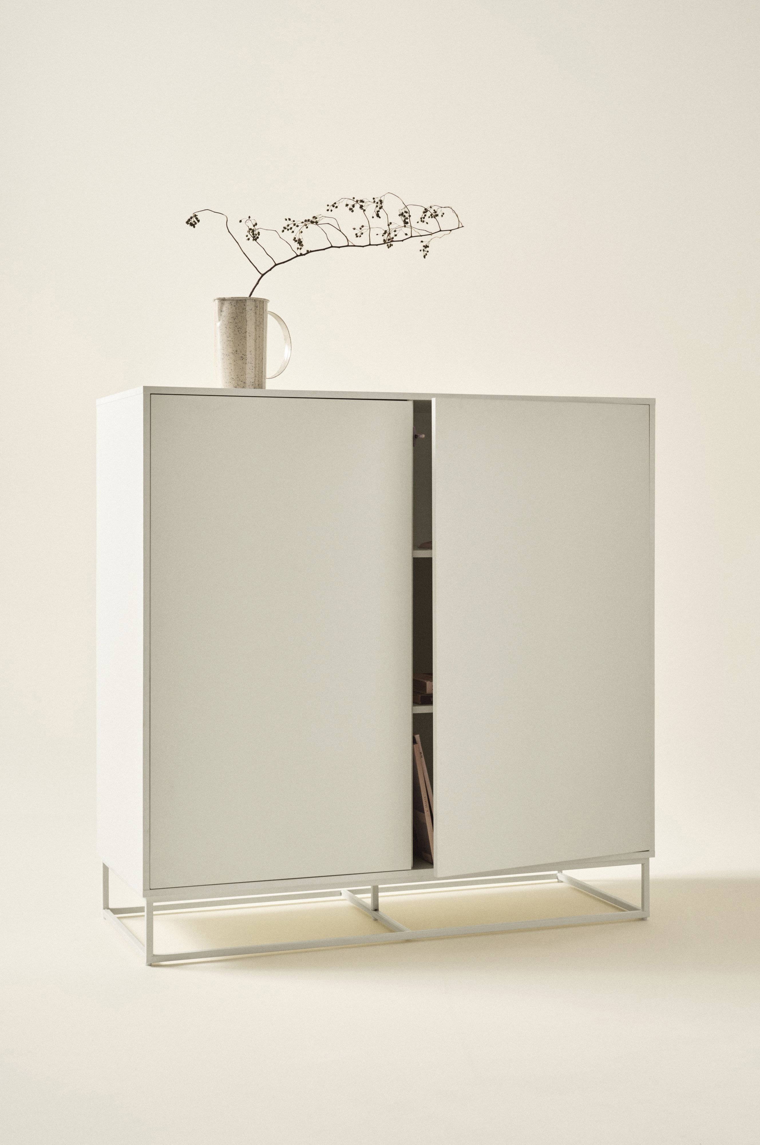 Szafka z płyty MDF i z metalową podstawą. Prosta i stylowa szafka z podwójnymi drzwiami z funkcją push. Dzięki temu szafka jest idealnie gładka, nie ma uchwytów, a mimo to łatwo ją otworzyć. W szafce znajdują się dwie półki. Szafka jest podzielona na dwie części, w których znajdują się po dwie półki o regulowanej wysokości. Części wykonane z MDF zostały pokryte lakierem na bazie wody. Prostokątna podstawa jest lakierowana proszkowo. Dzięki mocowaniom szafa może zostać przymocowana do ściany, jeśli zajdzie taka potrzeba. Wymaga częściowego montażu. Do produktu dołączona jest instrukcja montażu.