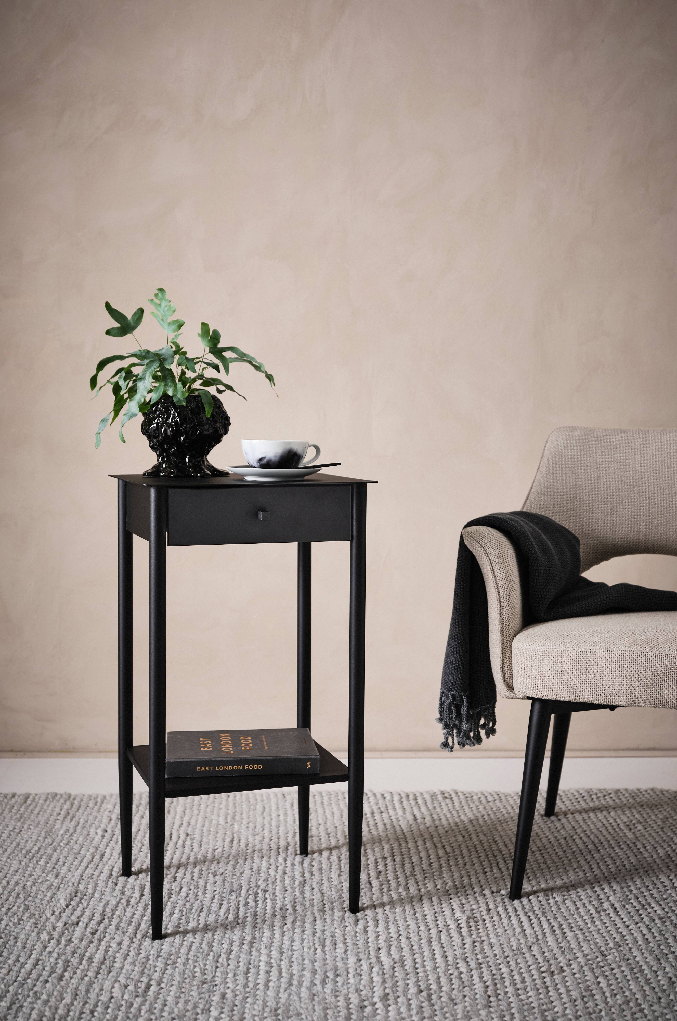 Stolik salonowy z lakierowanej proszkowo stali z półką i szufladą. Gałka szuflady jest wymienna, łatwo więc zmienisz styl całego stolika. W zestawie znajdują się trzy gałki - kanciasta gałka z metalu, okrągła z mosiądzu i kanciasta z mosiądzu. LYNTON to odważny stolik o pięknym kształcie, który wygląda świetnie przy sofie i sprawdzi się jako ładny mebel wolnostojący w Twoim domu.
