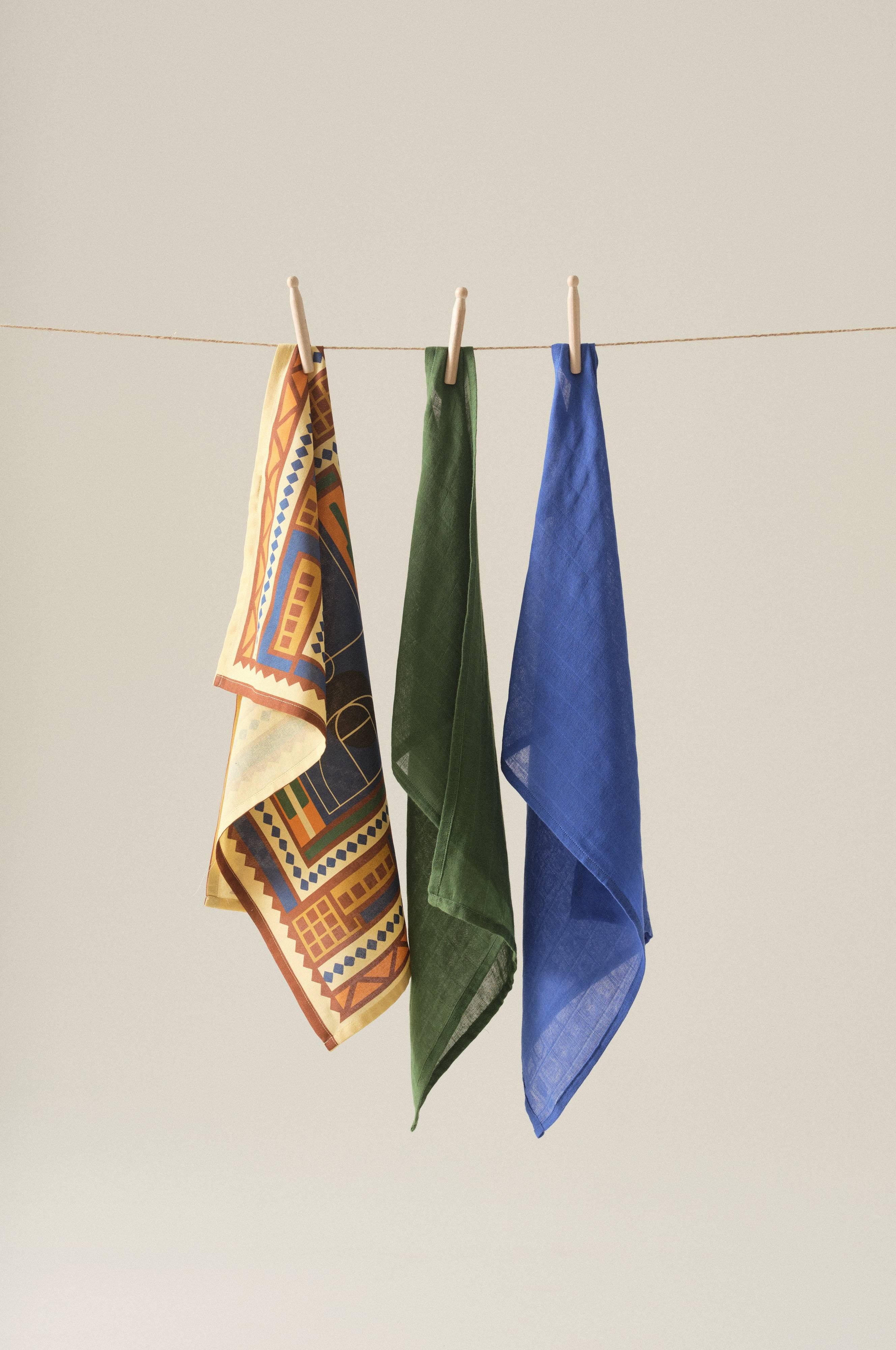 COURT YARD 3 ręczniki kuchenne o unikalnym designie autorstwa Mikaela Selina. Ręczniki wykonane są z bawełny. Dwa z nich są gładkie i z przyjemnego muślinu. Trzeci wykonany jest z półpanamy i odznacza się wzorem wzbudzającym zainteresowanie. Jego inspiracją była miejska zabudowa wokół boiska do koszykówki widziana z lotu ptaka.