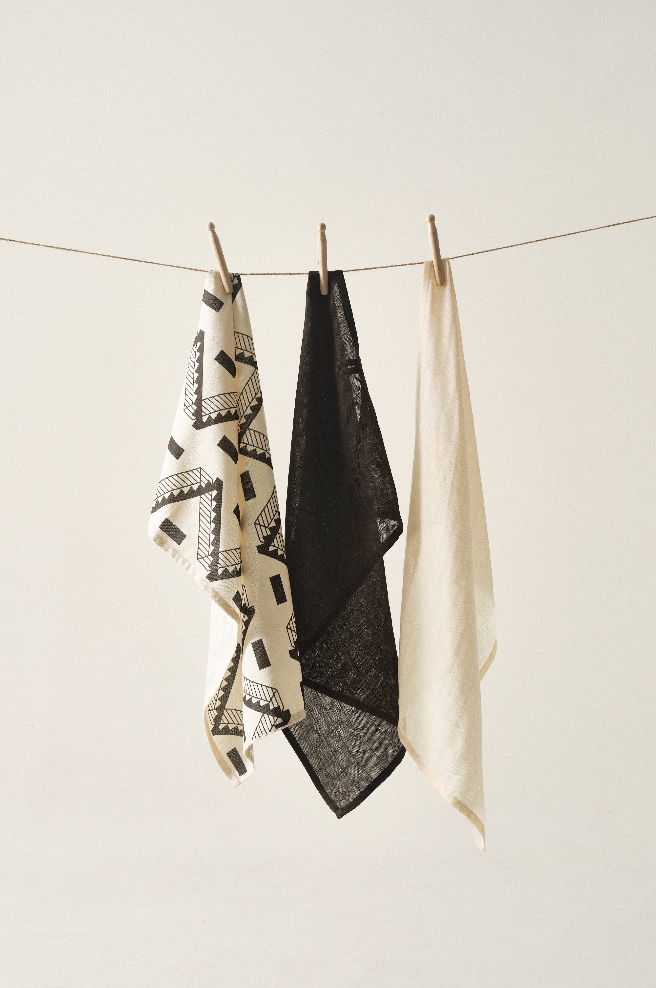STAIRS 3 ręczniki kuchenne o unikalnym designie autorstwa Mikaela Selina. Ręczniki wykonane są z bawełny. Wzorzysta półpanama jest ozdobiona wzorem STAIRS, który jest projektem graficznym o wielu poziomach. Przywodzi na myśl klasyczny wzór zygzaków, w którym zapragnęliśmy podkreślić bogactwo detali kryjące się w klasyce. Dwa ręczniki są gładkie i wykonane z przyjemnego muślinu.