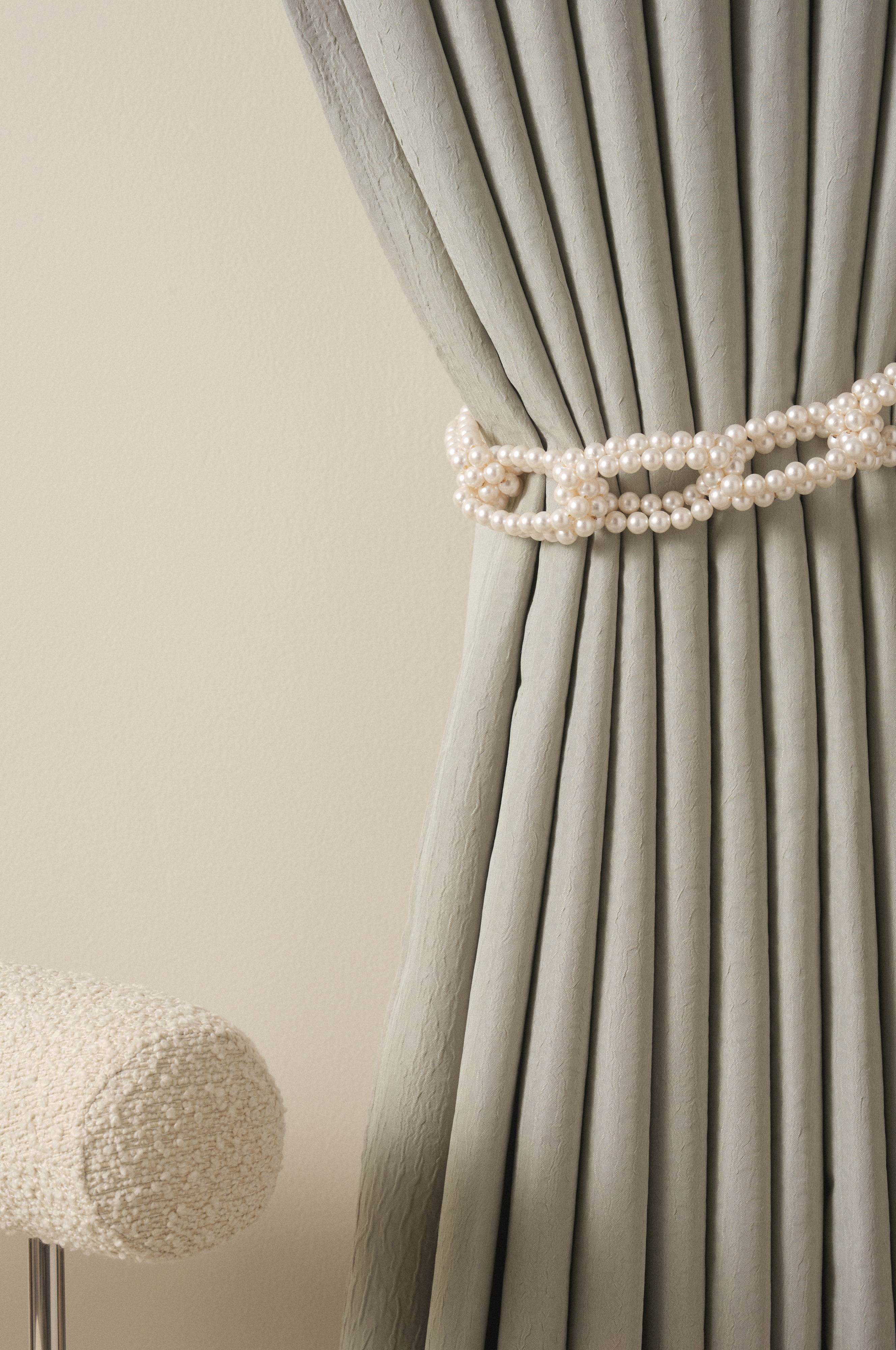 Opaska z frędzlami wykonana z plastikowych perełek, błyszczących niczym prawdziwa masa perłowa. Perełki układają się w niewielkie okręgi, które splatają się ze sobą i tworzą wyjątkowy upinacz do zasłon. Przypominająca klejnot opaska MABEL sprawi, że zasłony będą się pięknie układały.