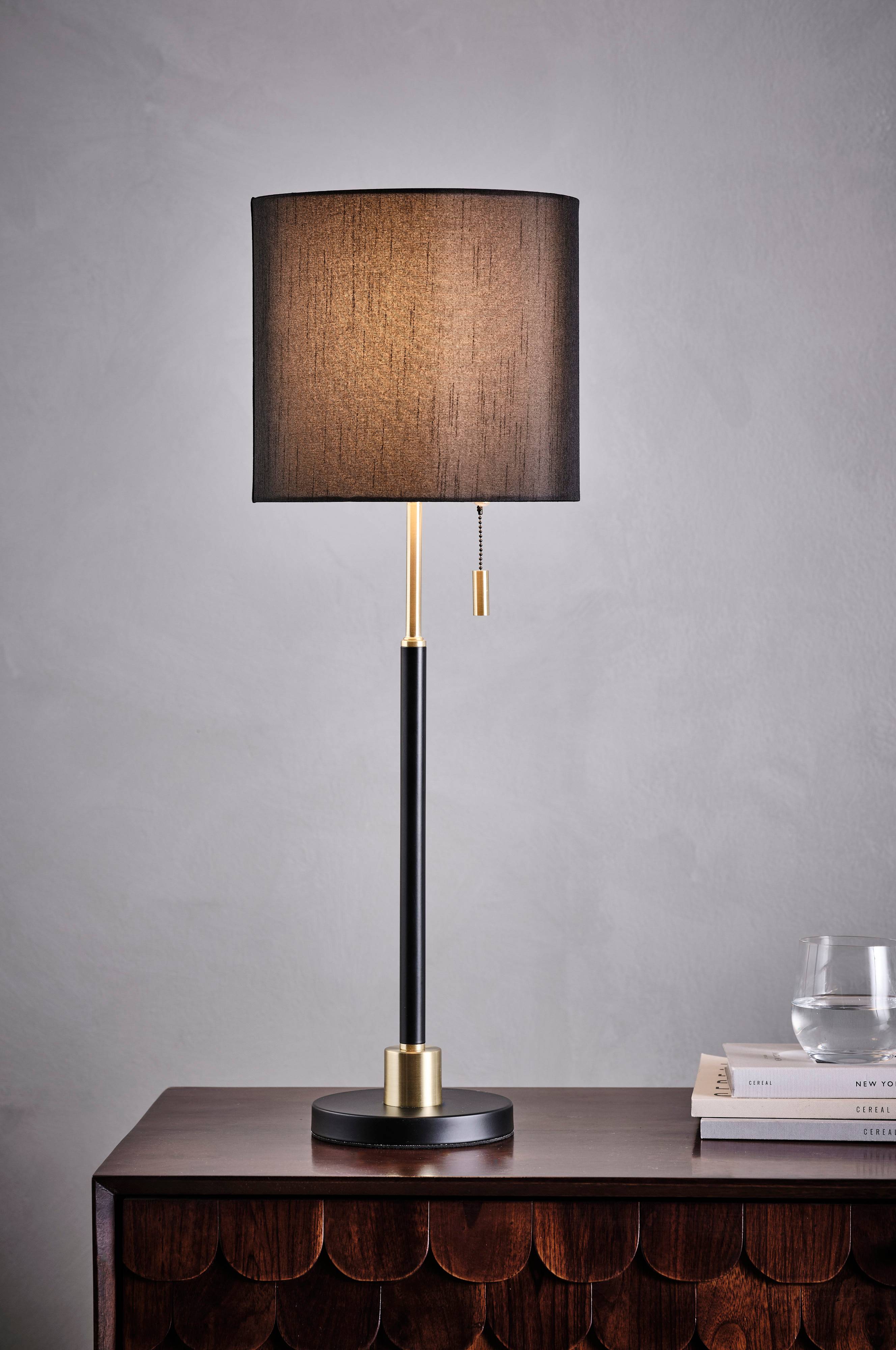 Lampa stołowa z podstawą wykonaną z matowego, czarnego metalu i detalami w kolorze mosiądzu. Klosz wykonany jest ze sztucznego jedwabiu o lekkiej strukturze i pięknym połysku, wnętrze klosza pokrywa warstwa laminatu. MAC to elegancka lampa z wyłącznikiem w kształcie mosiężnego cylindra na kulkowym łańcuszku. Czarny przewód.