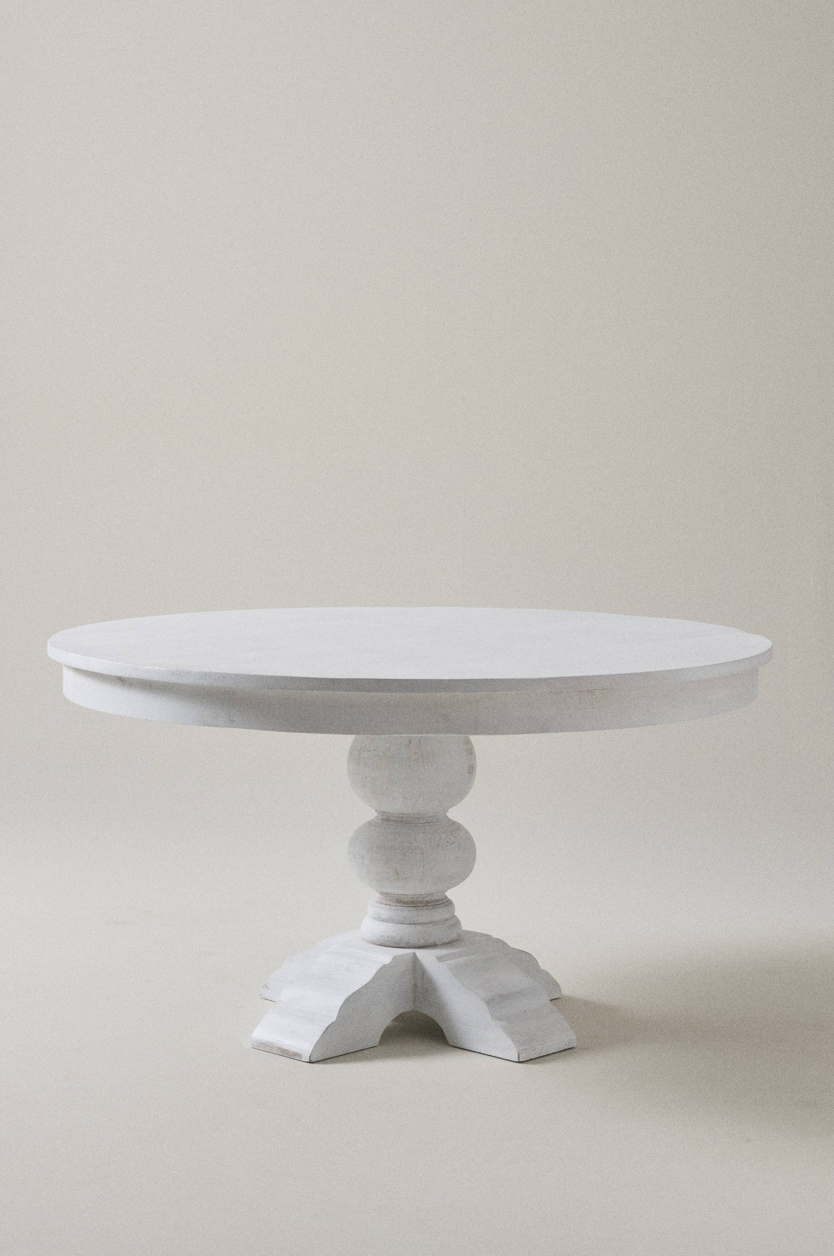 Okrągły stół z litego drewna mango. Ręcznie wykonany, piękny stół o rustykalnym uroku i delikatnej formie. MADURAI to klasyczny stół na jednej stabilnej, rzeźbionej, drewnianej nodze. Okrągły kształt stanowi naturalne zaproszenie do rozmowy. Ponieważ meble są wykonywane ręcznie, mogą pojawić się pewne różnice. Wymaga częściowego montażu. Do produktu dołączona jest instrukcja montażu.