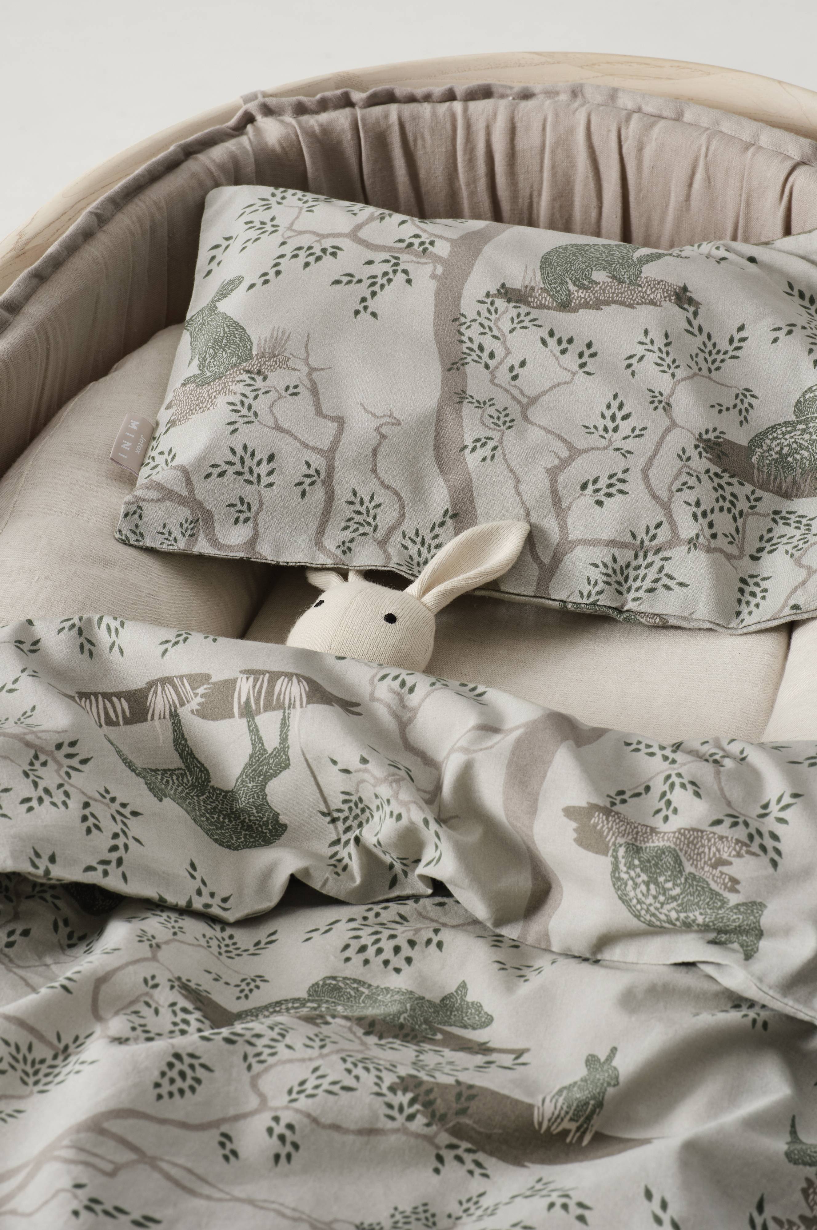 Dwuczęściowy komplet pościeli z ekologicznej bawełny z wzorzystym nadrukiem w harmonijnych odcieniach. Materiał został poddany praniu enzymatycznemu, dzięki czemu ma ciekawy, lekko znoszony wygląd. Komplet nadaje się do wózków i kołysek. Gęstość splotu materiału wynosi 144 TC. (Gęstość splotu materiału oznacza ilość przeplecionych ze sobą nici, thread count, na cal kwadratowy materiału. Im wyższa gęstość tym lepsza jakość).