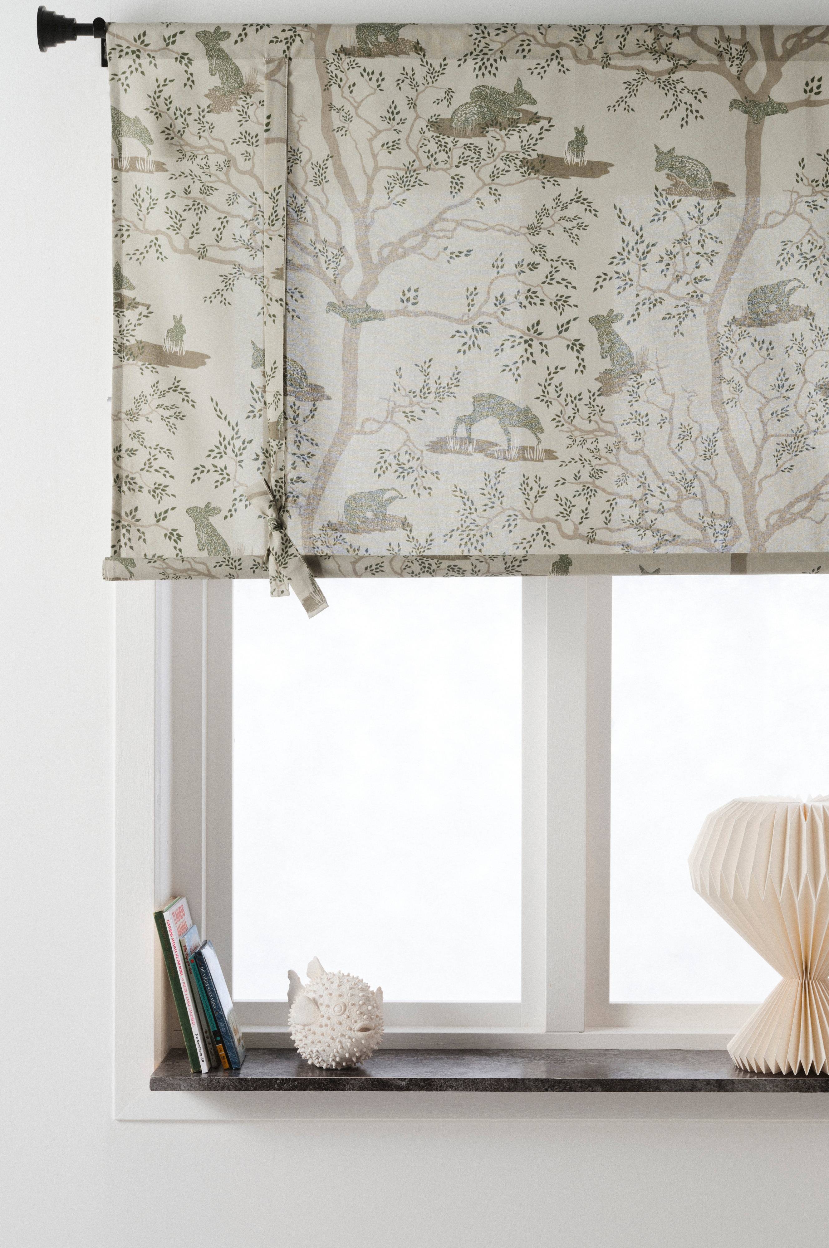 Roleta z wzorzystej bawełny o miękkiej powierzchni. Do zawieszenia na karniszu. Wysokość rolety regulowana jest wiązanymi tasiemkami.