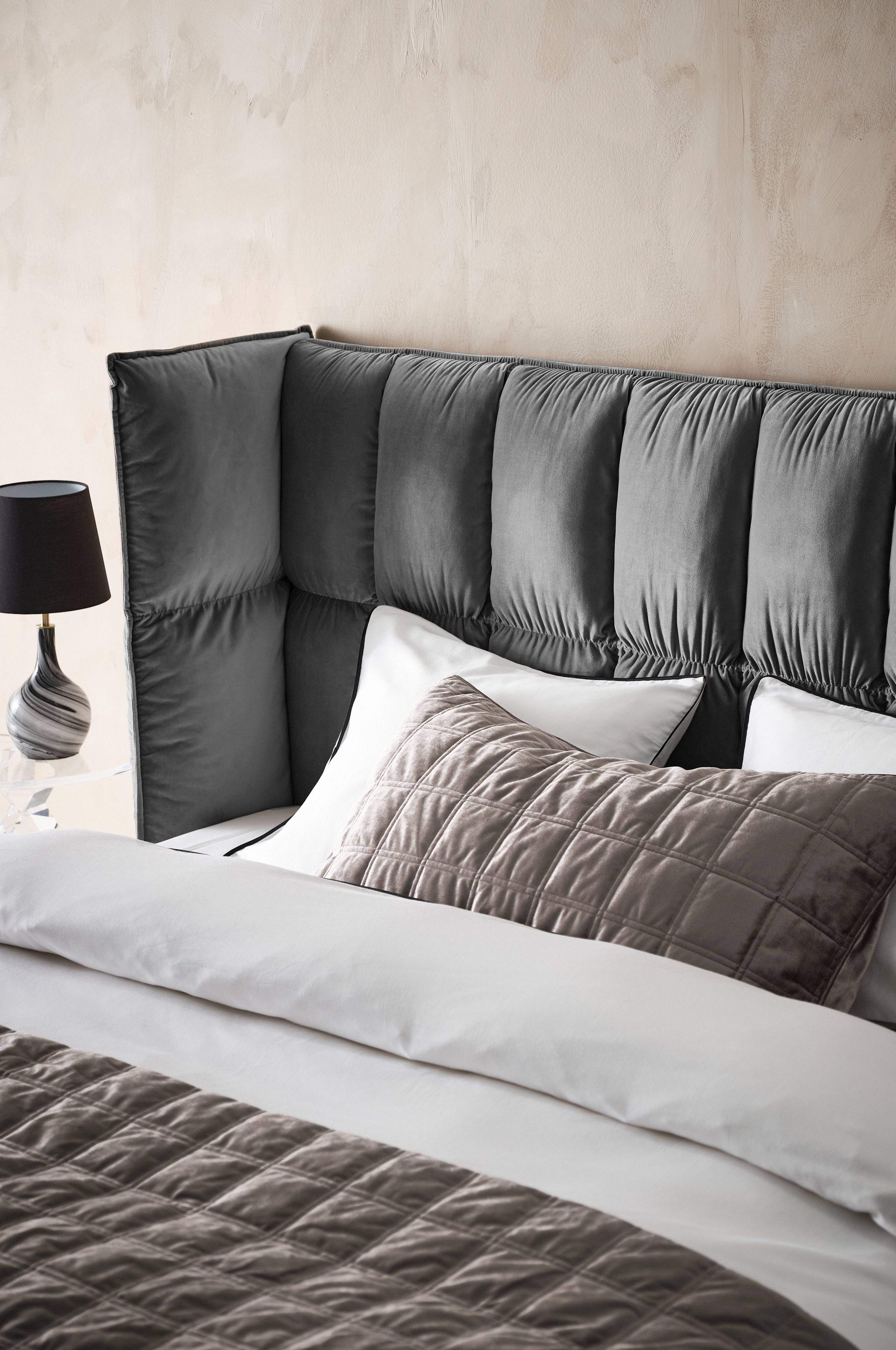 Wolnostojący szczyt łóżka obity ekskluzywnym aksamitem. Spraw, by sypialnia nabrała osobistego charakteru oraz stała się bardziej przytulna i wybierz ten solidny zagłówek z obiciem z miękkiego aksamitu. Materiał ma wytrzymałość 28 000 cykli Martindale'a. Mocowanie do ściany w zestawie.