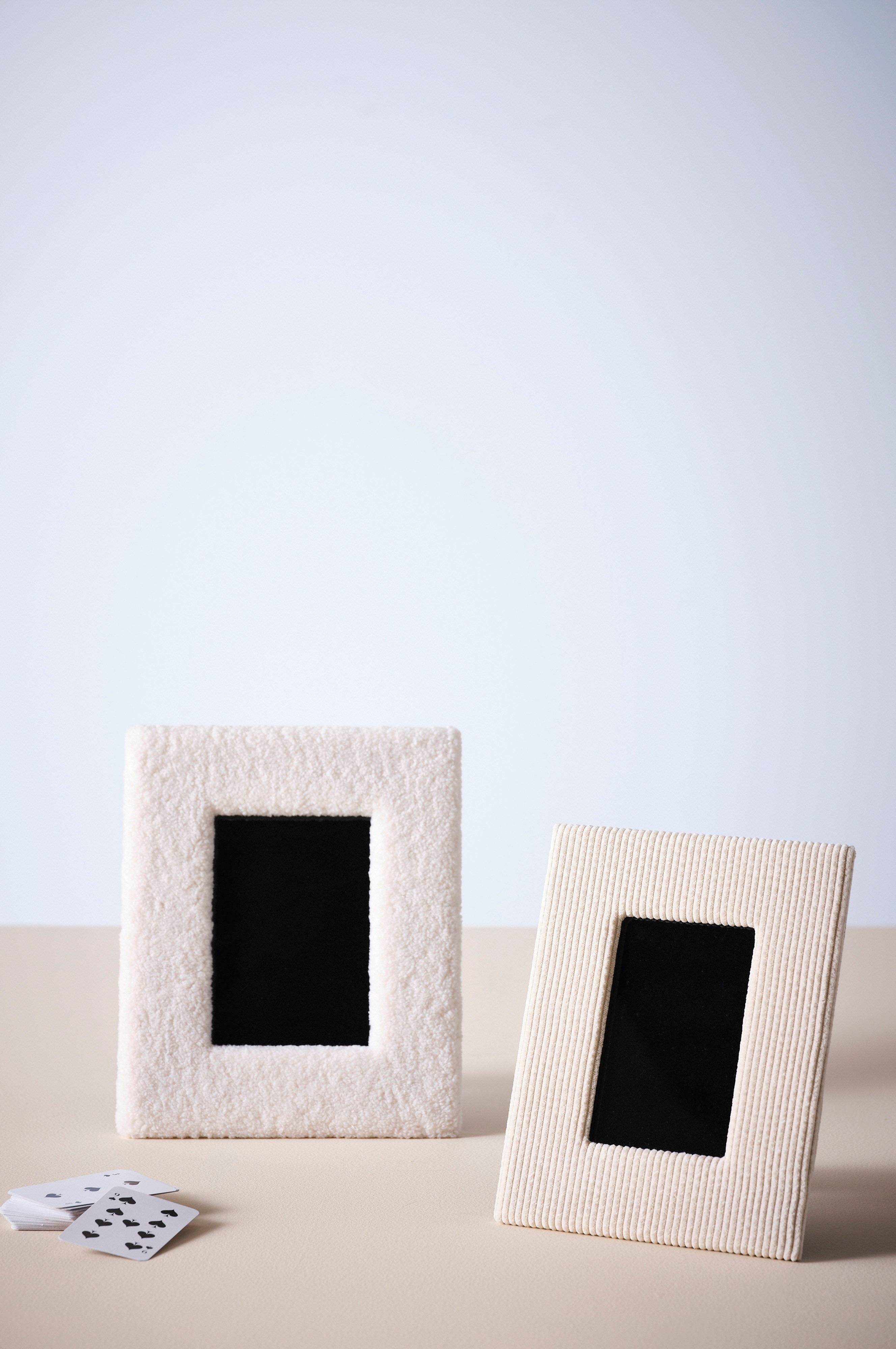 2 ramki wykonane z MDF z certyfikatem FSC oraz sztucznego futra. Dzięki nóżce zamocowanej na tylnej ściance ramka stoi stabilnie na meblu.