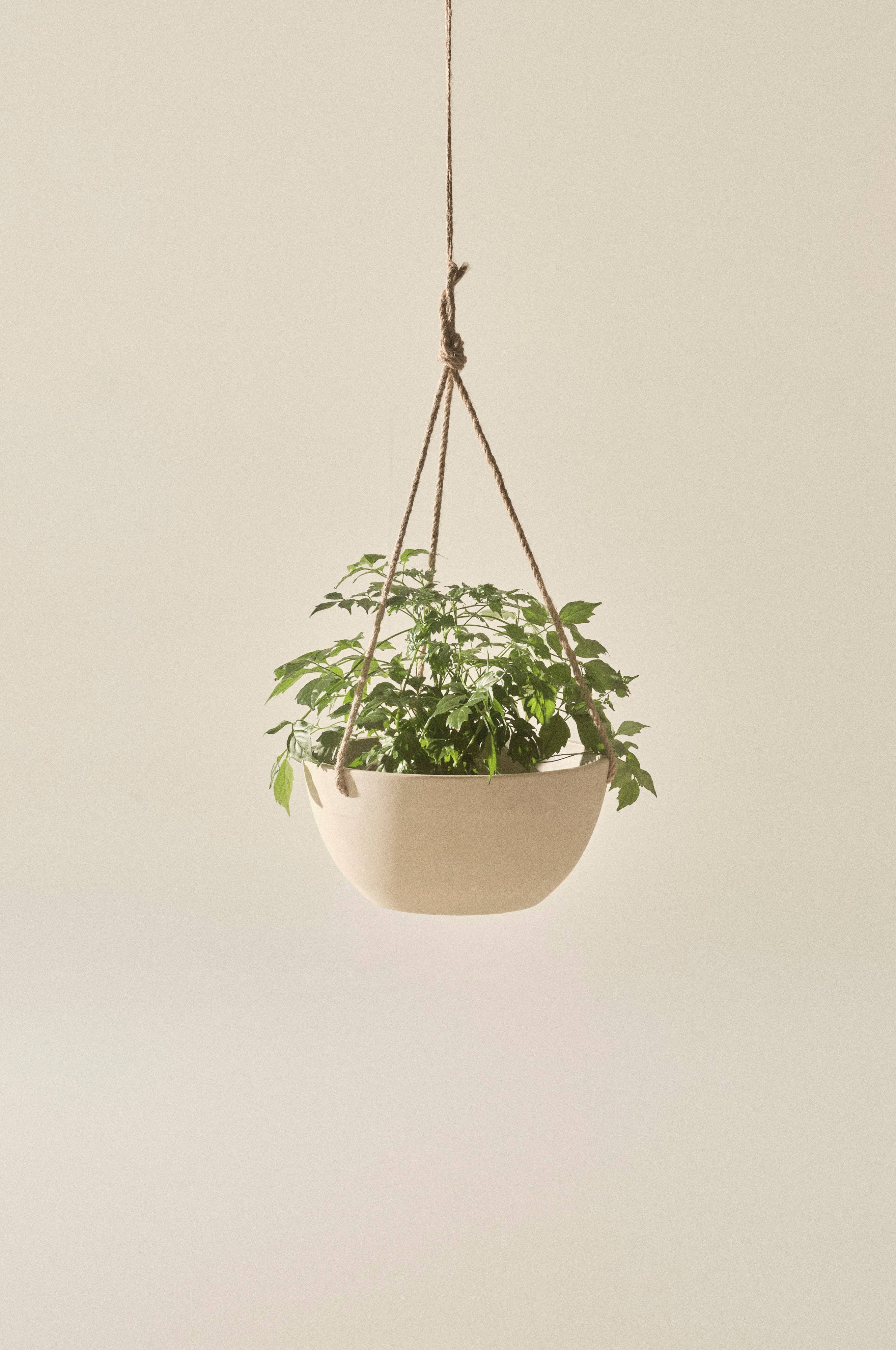 Wisząca doniczka ma sznurki do zawieszenia. Sznurek jest wykonany z juty, która jest materiałem naturalnym. Juta jest podatna na działanie słońca i wody i z czasem ulega rozkładowi.