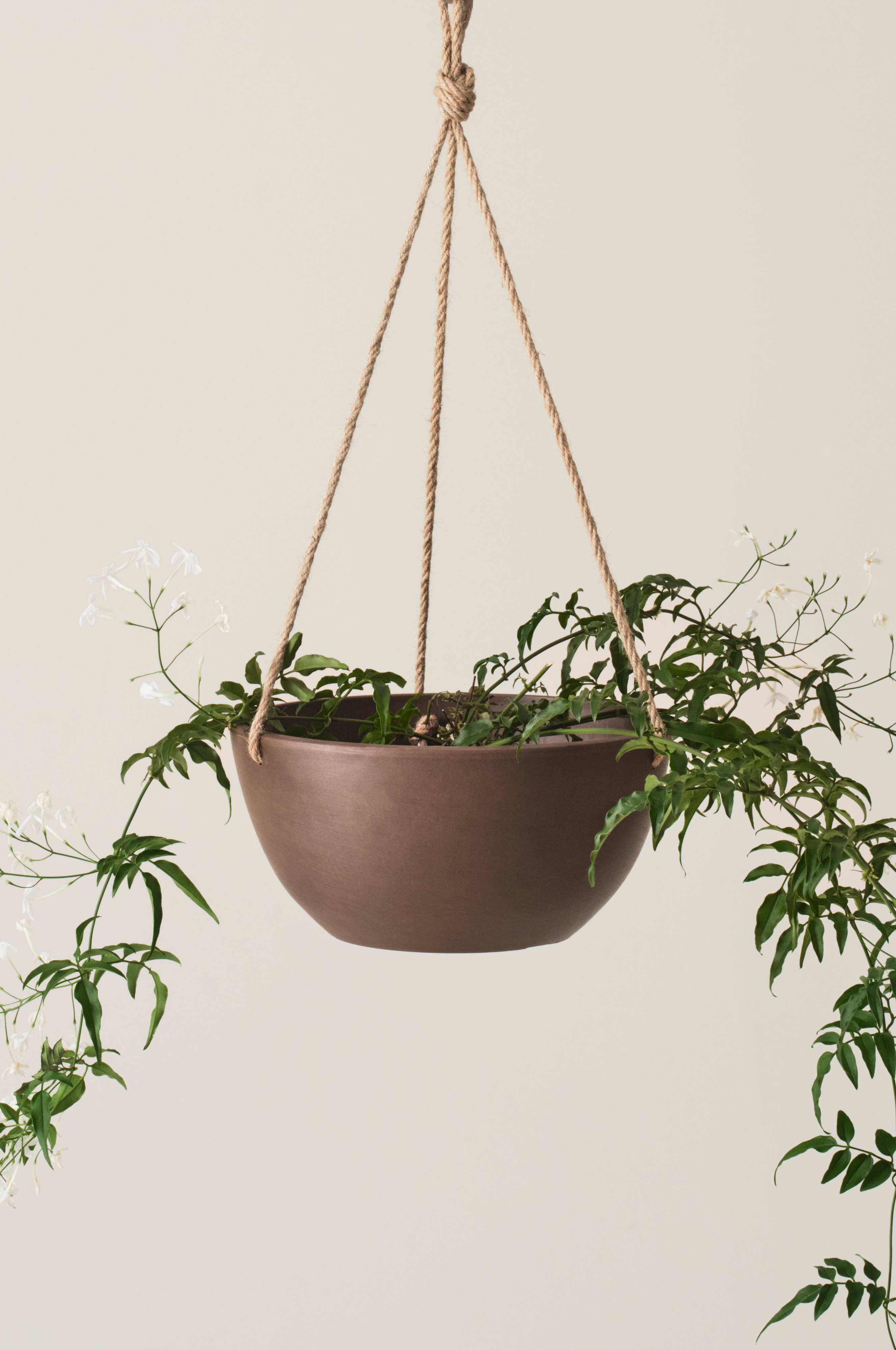 Wisząca doniczka ma sznurki do zawieszenia. Sznurek jest wykonany z juty, która jest materiałem naturalnym. Juta jest podatna na działanie słońca i wody i z czasem ulega rozkładowi.