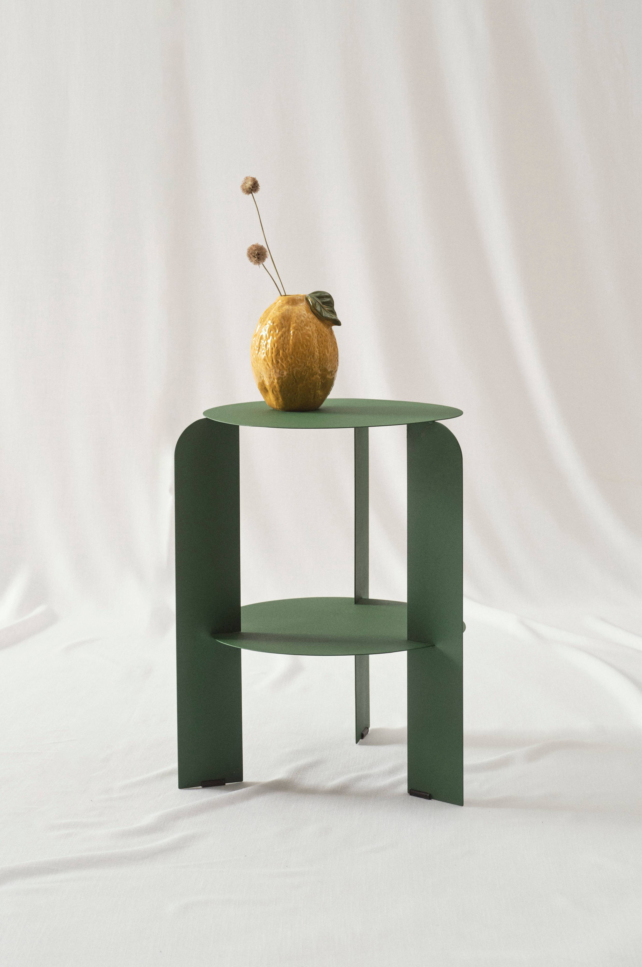 MAUREN to okrągły stolik wykonany z żelaza, z cienkim blatem u góry i równie cienką półką u dołu. Trzy nogi są proste, z zaokrąglonymi górnymi krawędziami, które wystają nieco poza blat. Stolik został pomalowany farbą, która nadaje mu delikatną fakturę. Drobne gumowe podkładki umocowane pod nogami chronią podłogę przed zarysowaniem.