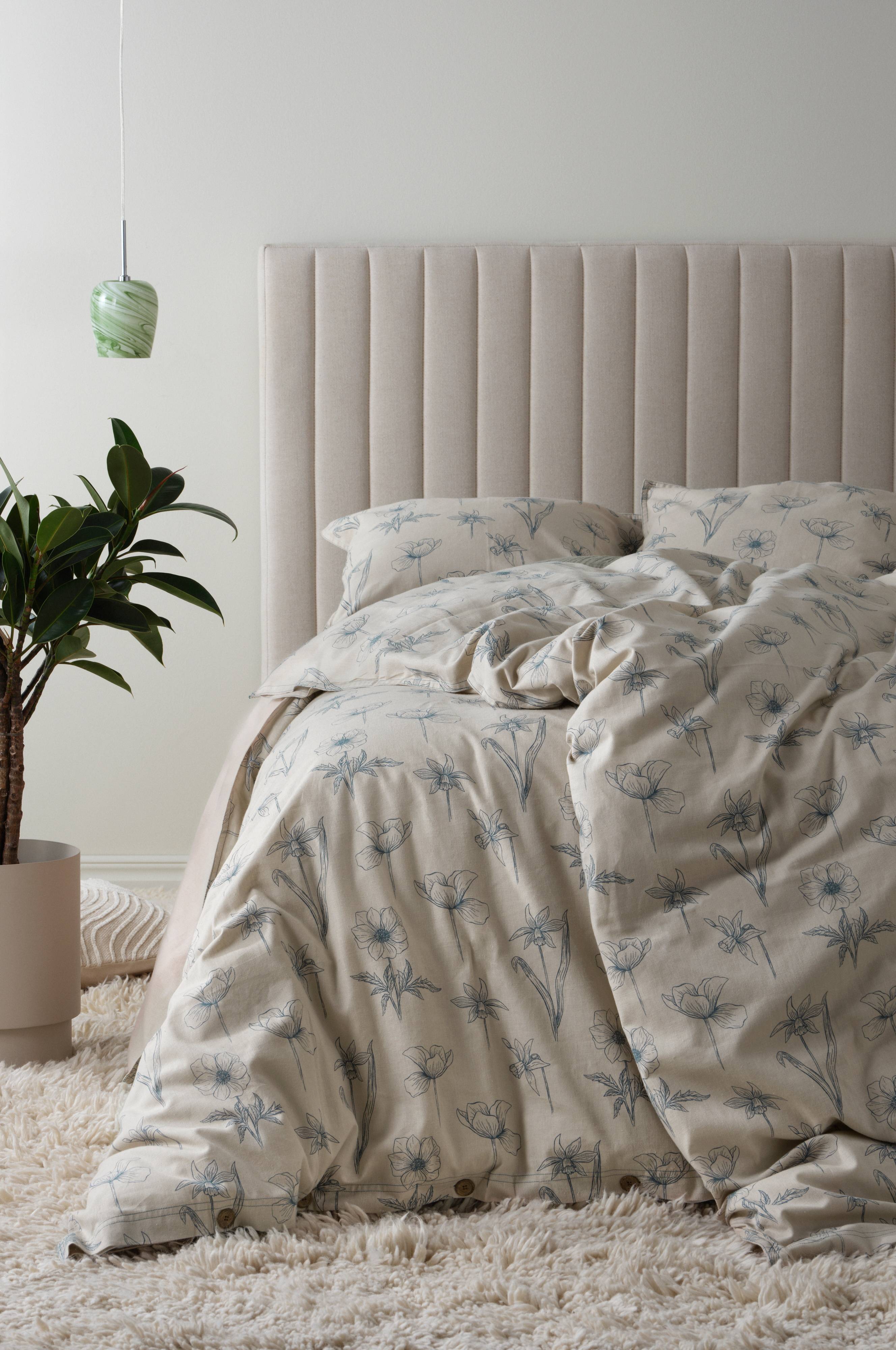 Poszwa wykonana ze wspaniałej mieszanki bawełny i lnu. Piękna tkanina łączy w sobie miękkość bawełny z naturalnym ciepłem lnu. Dodatkowo, tkanina została poddana praniu przemysłowemu, dzięki jest jeszcze przyjemniejsza dla ciała. MEADOW jest dwustronna, po jednej stronie zdobi ją eteryczny, cudownie wiosenny wzór kwiatów, druga jest gładka. Poszwa obszyta została wzdłuż krawędzi podwójnym szwem, który stanowi jej dekorację i pasuje kolorem do koloru wzoru. Zapinana jest na plastikowe guziki o wyglądzie drewna. Gęstość splotu materiału wynosi 80 TC. (Gęstość splotu materiału oznacza ilość przeplecionych ze sobą nici, thread count, na cal kwadratowy materiału. Im wyższa gęstość tym lepsza jakość. Wyjątkiem są tkaniny z lnu, które zazwyczaj mają rzadki splot, co przekłada się na wygodę używania.)