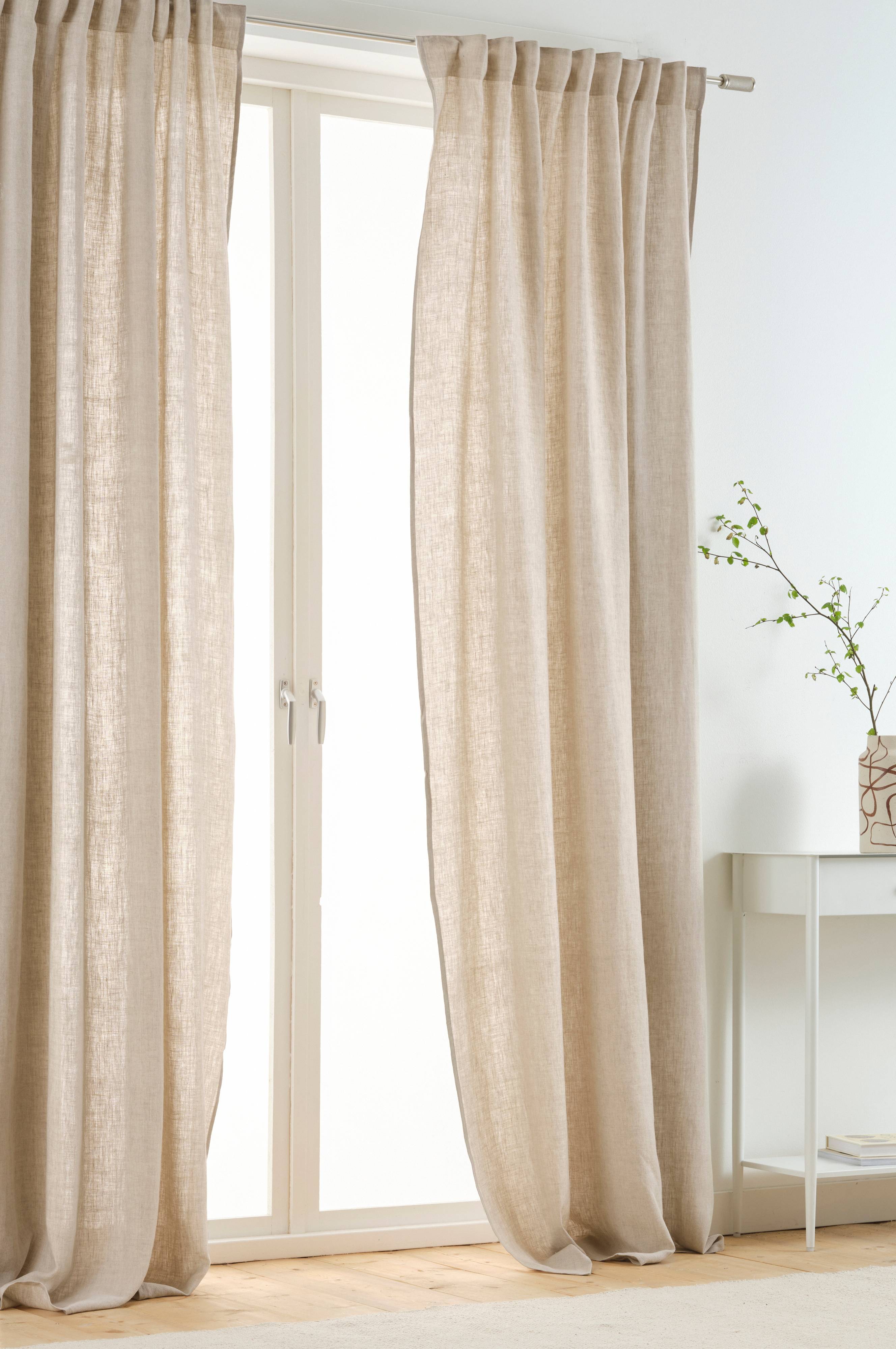 Dwie zasłony z pięknej lnianej tkaniny. Zasłony mają wszytą taśmę wielofunkcyjną. Zasłony można zawiesić na haczykach, tunelu lub krytych szelkach. MEJA to kolekcja gładkich tkanin w pięknych odcieniach. Połączenie koloru i jakości tworzy harmonię i równowagę.