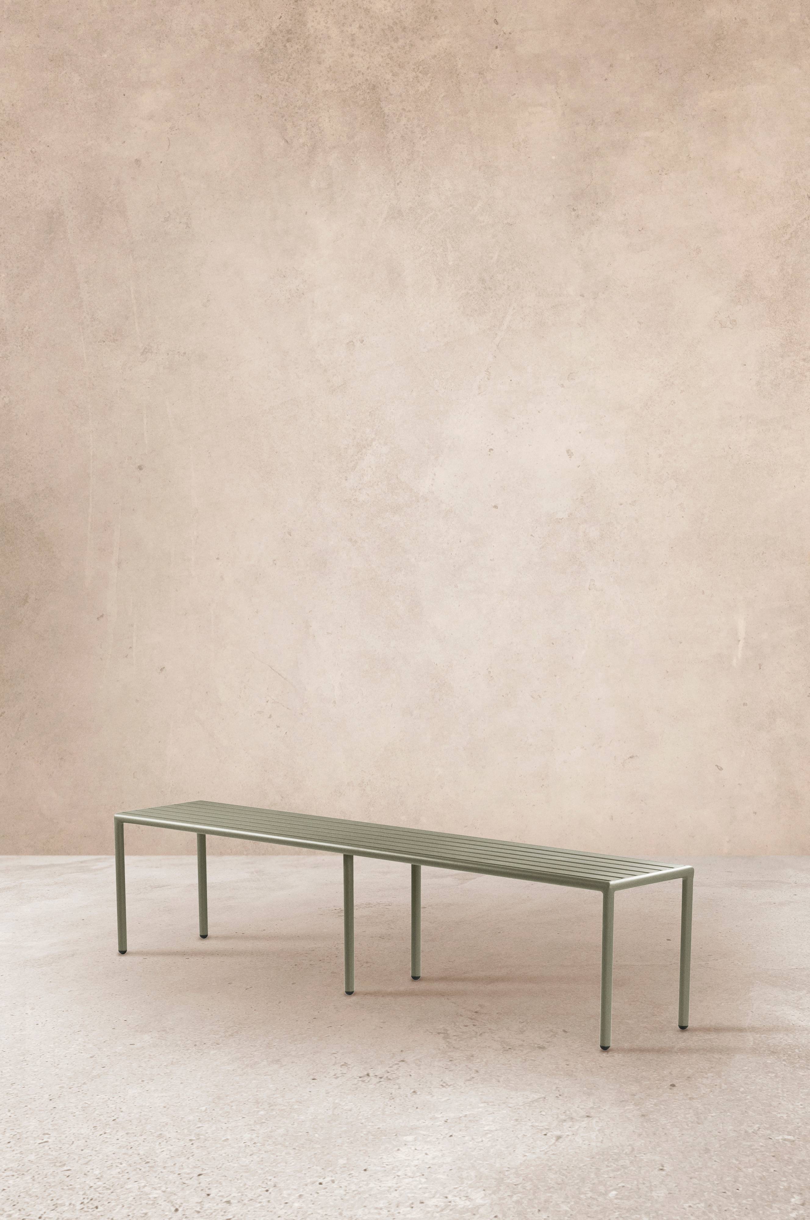 Ławka z lakierowanego proszkowo aluminium z matową powierzchnią, która nie odbija promieni słonecznych. MENTON może stać na zewnątrz i ułatwiać czas spędzany na dworze. Unikniesz przenoszenia mebli, kiedy zapragniesz posiedzieć na świeżym powietrzu. Mebel jest zgrabny i łatwy do ustawienia przy wejściu, na balkonie albo w altanie. Mała waga.