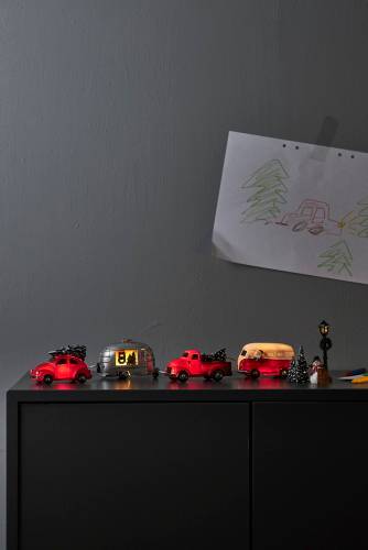 Zestaw dekoracyjny składający się z ośmiu elementów, idealny na Boże Narodzenie. Zestaw składa się z trzech samochodów, przyczepy kempingowej, latarni, choinek, bałwana i łańcucha świetlnego. Wnętrze samochodów i przyczepy kempingowej przyjemnie rozświetla się po włączeniu. Produkt jest zasilany bateryjnie. Ustaw na stole lub na półce, aby stworzyć przyjemną świąteczną atmosferę.