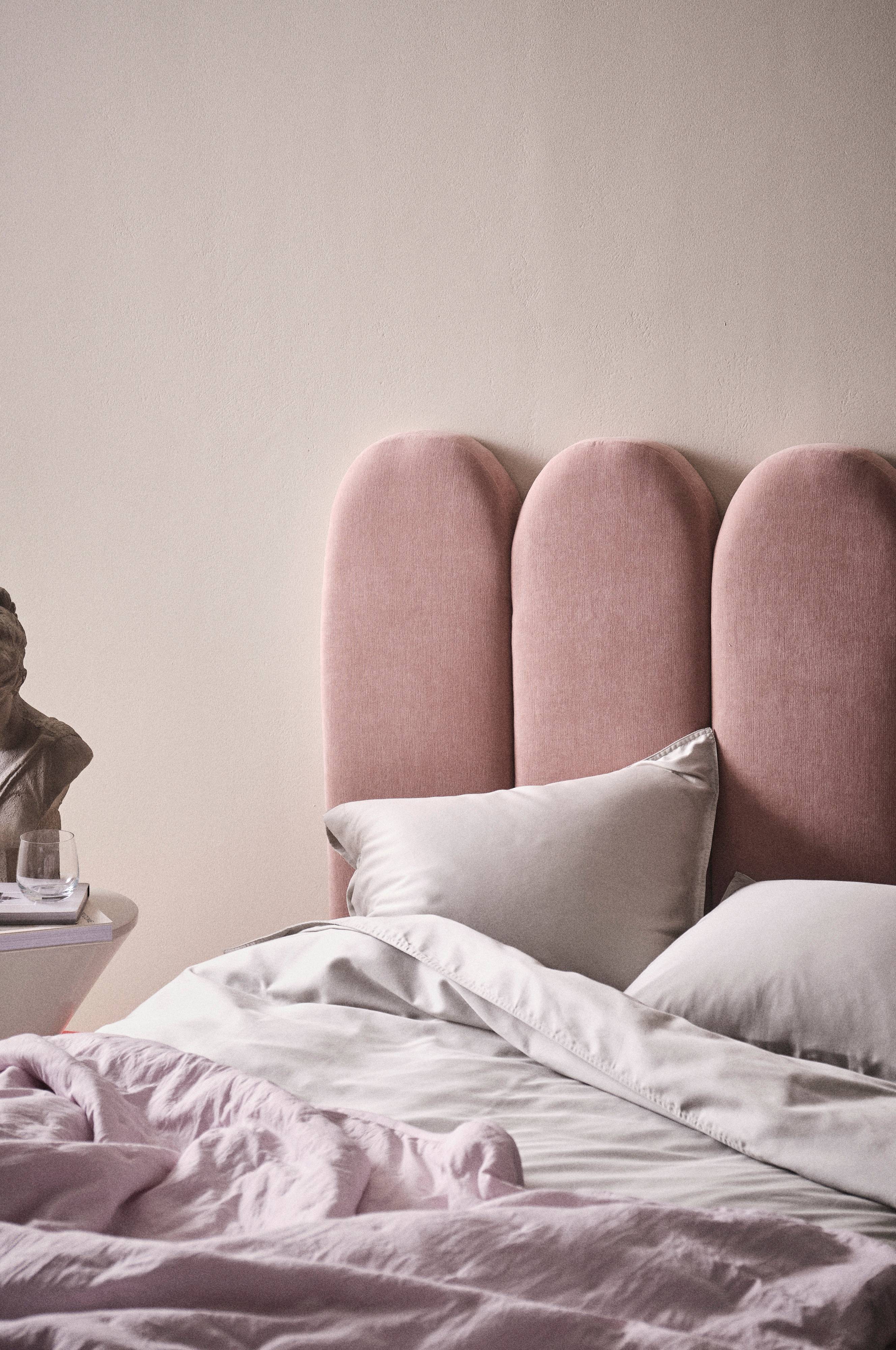 Zagłówek o miękkim i wesołym kształcie, z miękkim wyściełaniem, dzięki czemu wygodnie jest usiąść i oprzeć się o niego. Zagłówek pokryty jest piękną tkaniną szenilową, która jest odporna na przecieranie i odznacza się wytrzymałością rzędu 33 000 cykli Martindale'a. Ramę wykonano z drewna sosnowego ze znakiem FSC i sklejki, uzupełnionych miękkim wypełnieniem z pianki. Zagłówek montuje się do ściany za materacem sprężynowym. Pokrycie nie jest zdejmowane. Mocowania do ściany w zestawie.