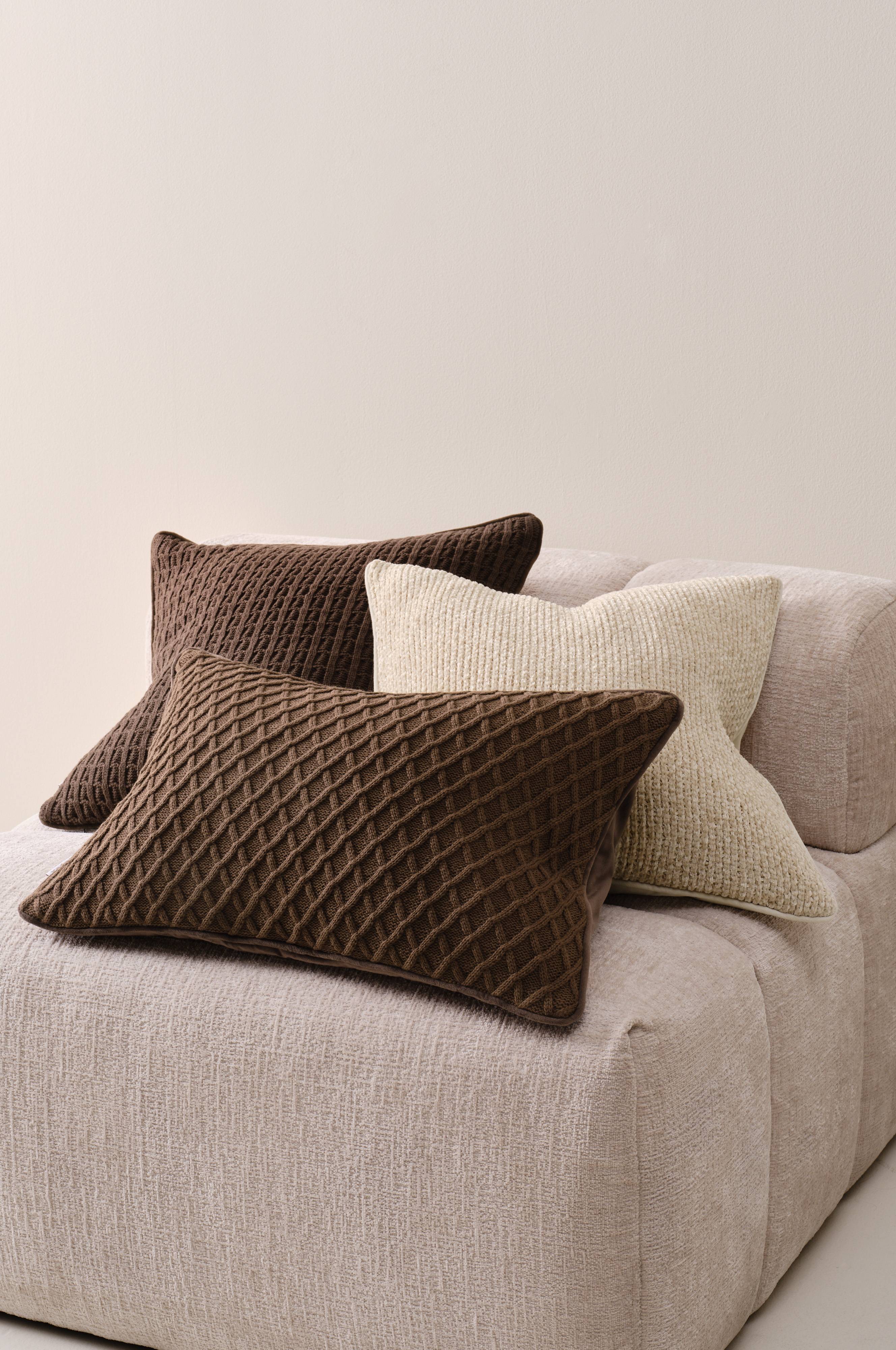 3-pak poszewek na poduszki z dzianinowym przodem. Tylna strona jest wykonana z połyskującego aksamitu. Trzy poszewki na poduszki są różne i idealnie do siebie pasują, dwie są kwadratowe, a jedna prostokątna. Poszewka na poduszkę ma małą krawędź dookoła i zamek błyskawiczny na dole.
