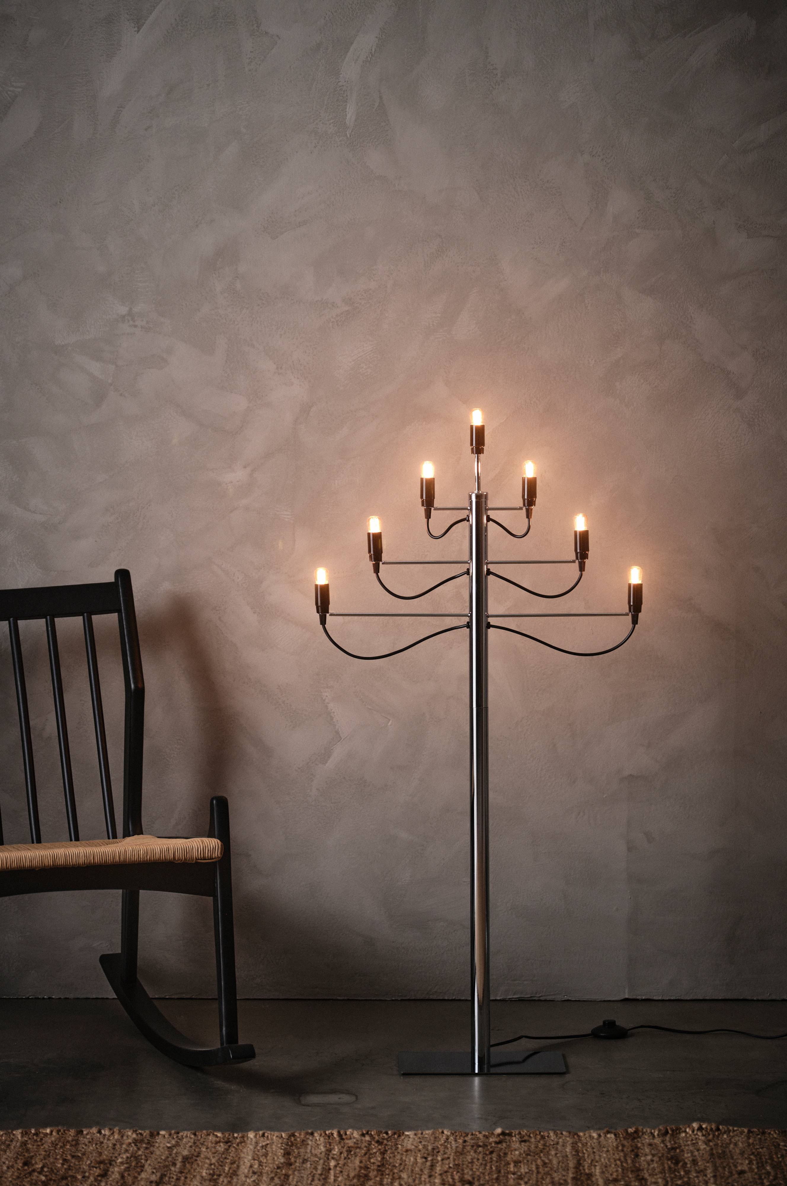 Stylowy i nowoczesny świecznik połogowy z chromowanego metalu na siedem lampek. Po ustawieniu go na podłodze wnętrze nabierze nowoczesnego charakteru. Żarówki nie wchodzą w skład zestawu. Czarny przewód o długości 1,8 m.