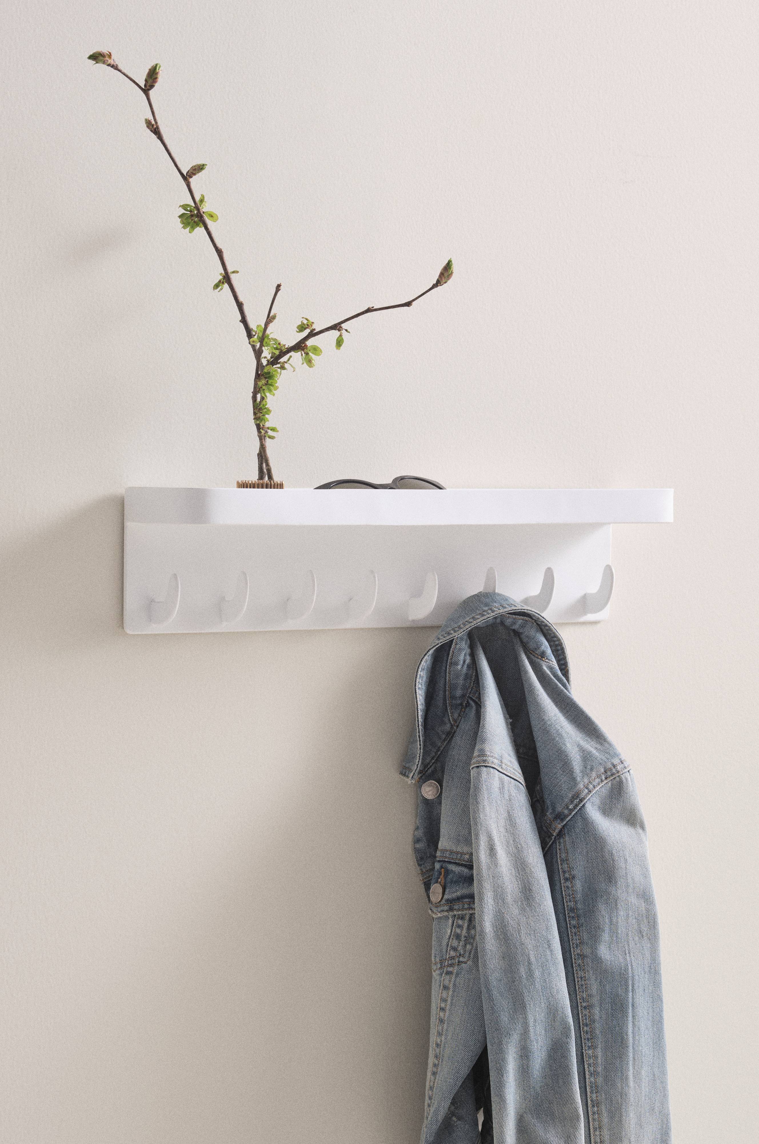Wykonany z żelaza wieszak o ośmiu haczykach umieszczonych pod praktyczną półką. Dzięki praktycznemu kształtowi haczyków ubrania i torebki wiszą pewnie i nie ześlizgują się na ziemię. Półka ma nieco wyższy brzeg, więc klucze, komórka i inne drobiazgi pozostają na swoim miejscu. Cały wieszak jest malowany na czarno.