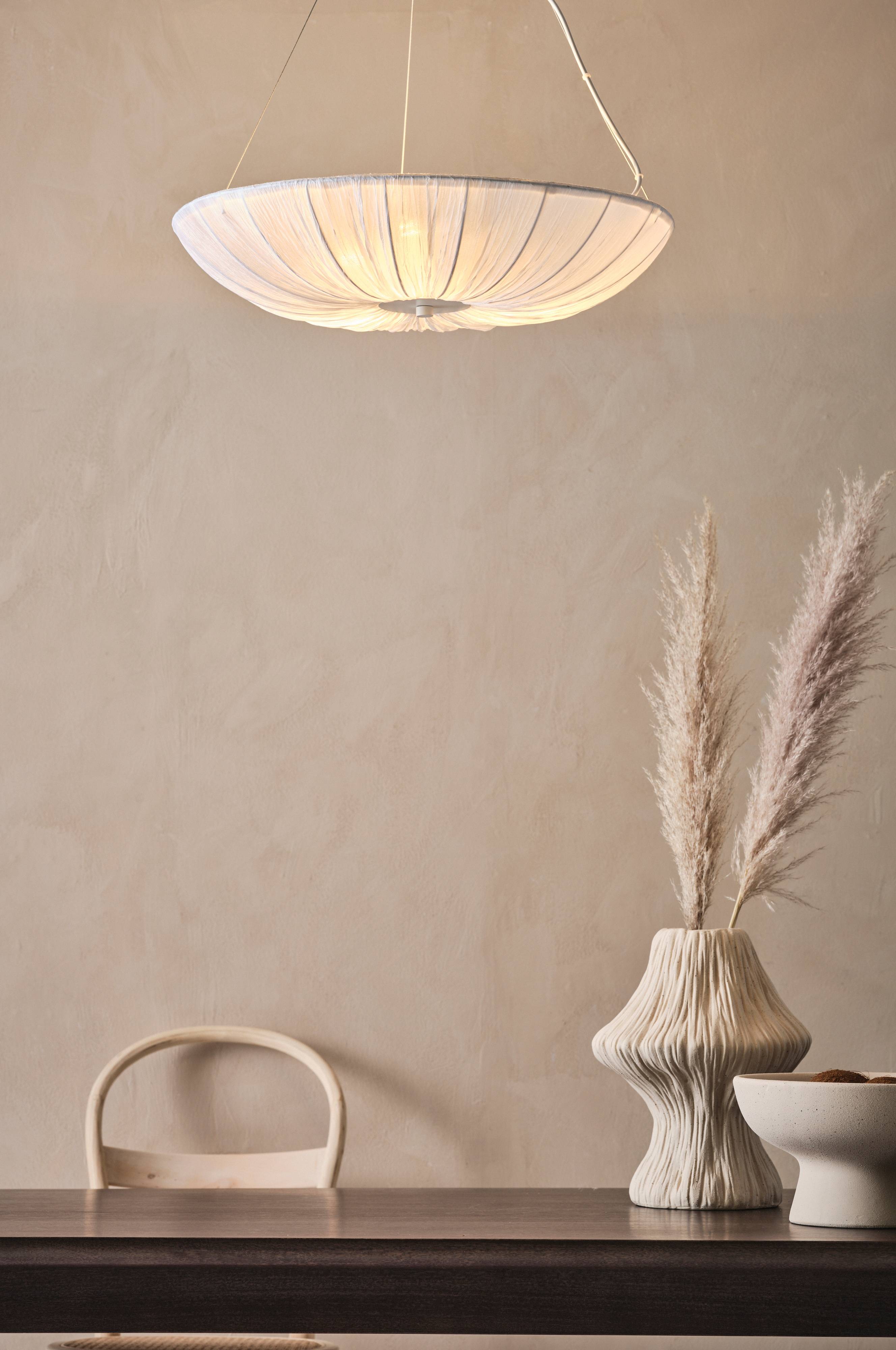 Lampa sufitowa z materiałowym kloszem i metalową ramą. Lampa przypomina niewielką chmurkę i zdradza wyraźne inspiracje stylem retro. Roztaczany przez nią przyjemny blask sprawia, że lampa jest bardzo łatwa do dopasowania. Puszka sufitowa z hakiem do zawieszenia również jest wykonana z metalu. Lampa zawieszona jest na trzech linkach o regulowanej długości, więc łatwo możesz umieścić lampę na właściwej wysokości. Lampa jest uziemiona, klasa 1. Ze względu na regulacje unijne, w niektórych krajach wymagany jest dodatkowy przełącznik sufitowy. Przełącznik sufitowy powinien być uziemiony (klasa 1) i kupiony oddzielnie.