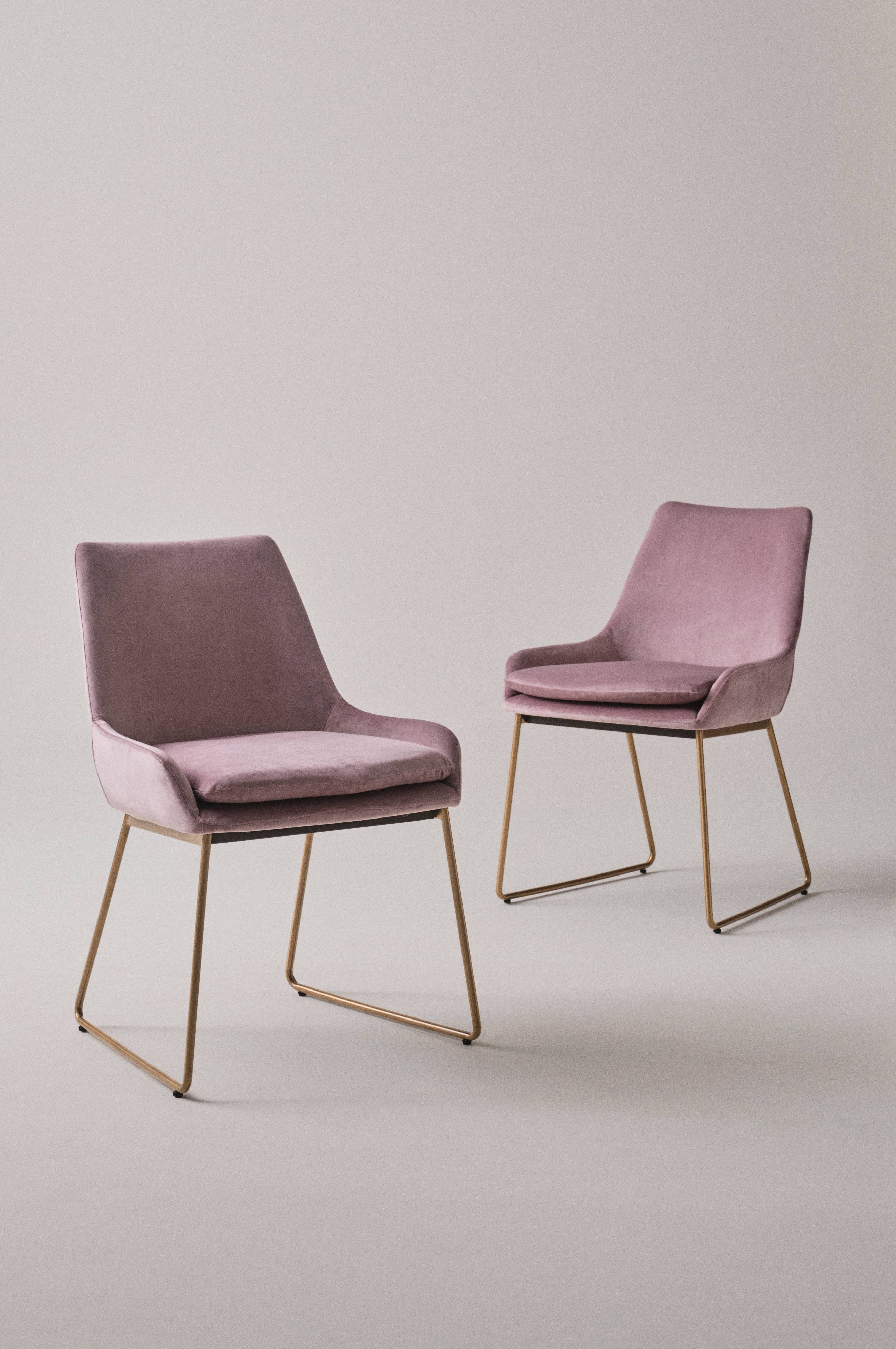 2 krzesła z aksamitną tapicerką, która nadaje luksusowego i wygodnego charakteru. Boki i oparcie są miękko wyściełane. Krzesło ma też luźną poduszkę siedzenia. Nóżki wykonane są ze stali nierdzewnej i pokryte mosiądzem lub lakierowane proszkowo na czarno. Dzięki stylowej formie, krzesła pasują do wielu domów i pomieszczeń. Materiał ma wytrzymałość 28 000 cykli Martindale'a. Wymaga częściowego montażu. Do produktu dołączona jest instrukcja montażu.