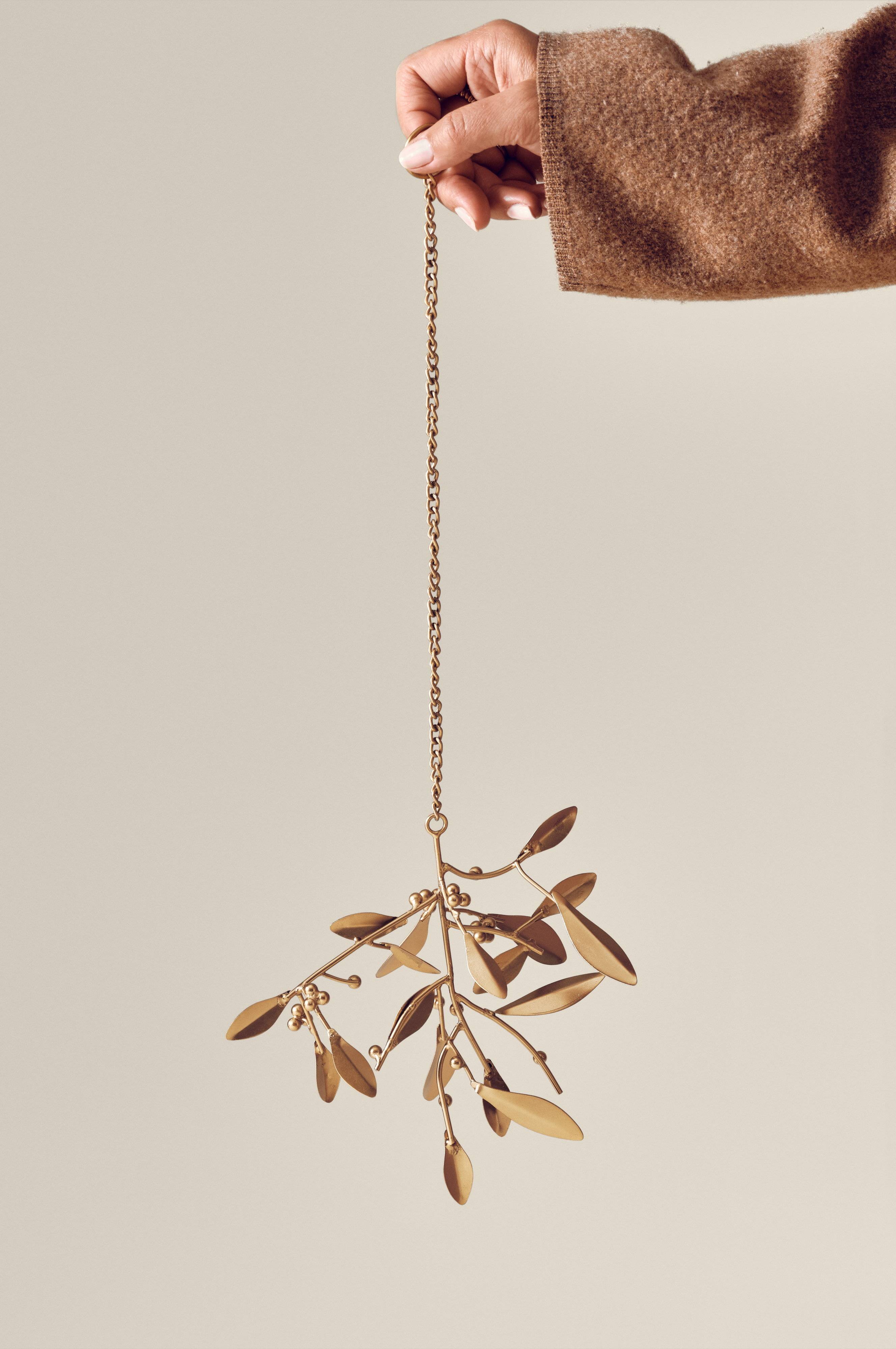 Dekoracja z jemioły, idealna dla świątecznego uroku. MISTEL jest wykonany z żelaza z pięknym mosiężnym wykończeniem. Zawieszona na łańcuszku, dodaje niesamowitego blasku świątecznym uroczystościom.