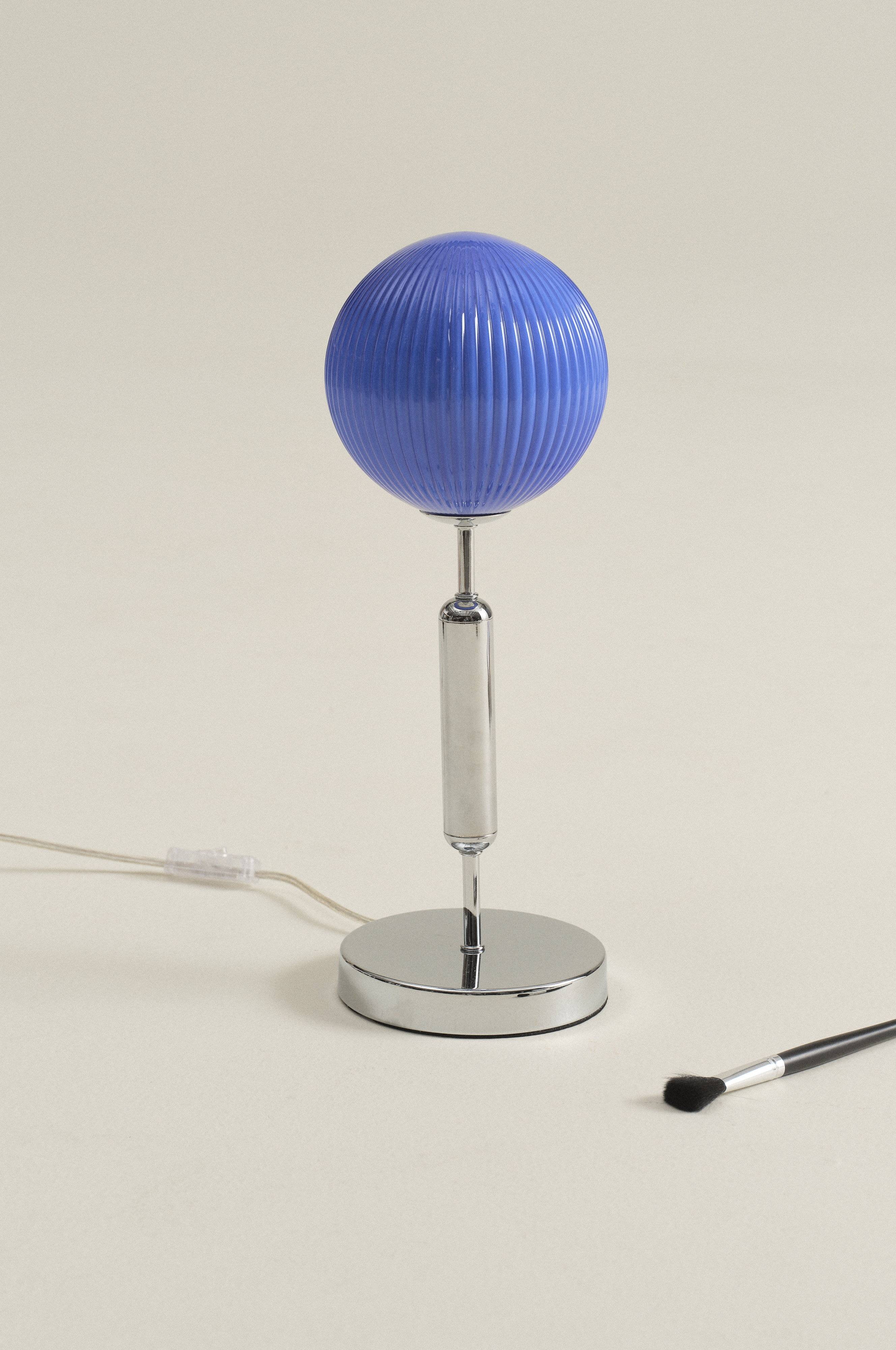 Lampa stołowa na nodze z chromowanego żelaza, jej okrągły szklany klosz zdobią strukturalne paski sprawiając, że lampa roztacza piękny blask. Przełącznik został umieszczony na przezroczystym przewodzie. Europejski model wtyczki, czyli płaska główka z cienkimi bolcami (4 mm).