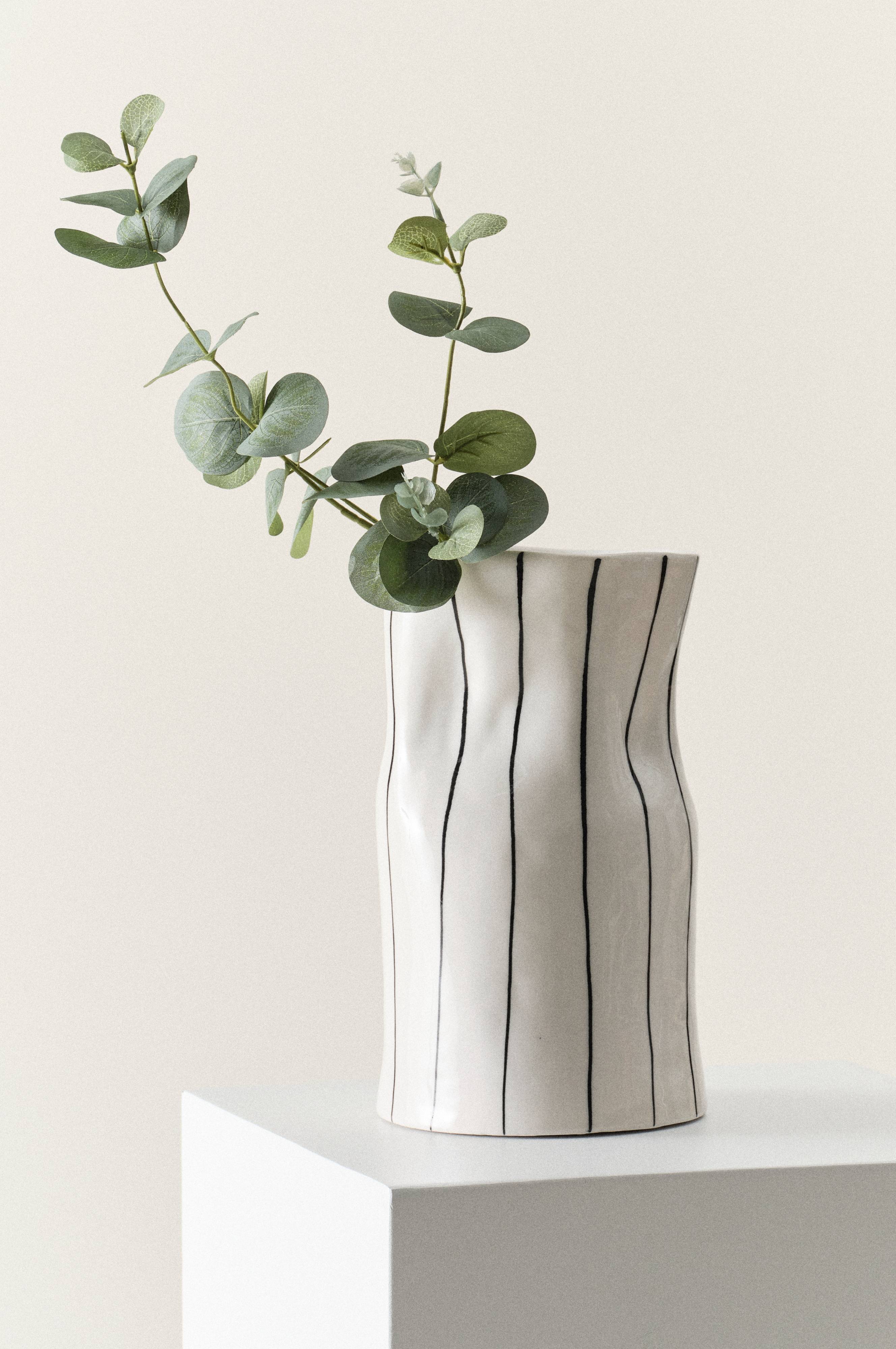 MOJ to przytulny wazon z ceramiki o nieregularnym kształcie, nieco pomięte kształty, przez które biegną wąskie paski. Błyszcząca glazura nałożona ręcznie została wzbogacona ręcznie malowanymi paskami w czarnym kolorze. Szkliwione jest również wnętrze. Wyroby ceramiczne mogą przepuszczać wilgoć.