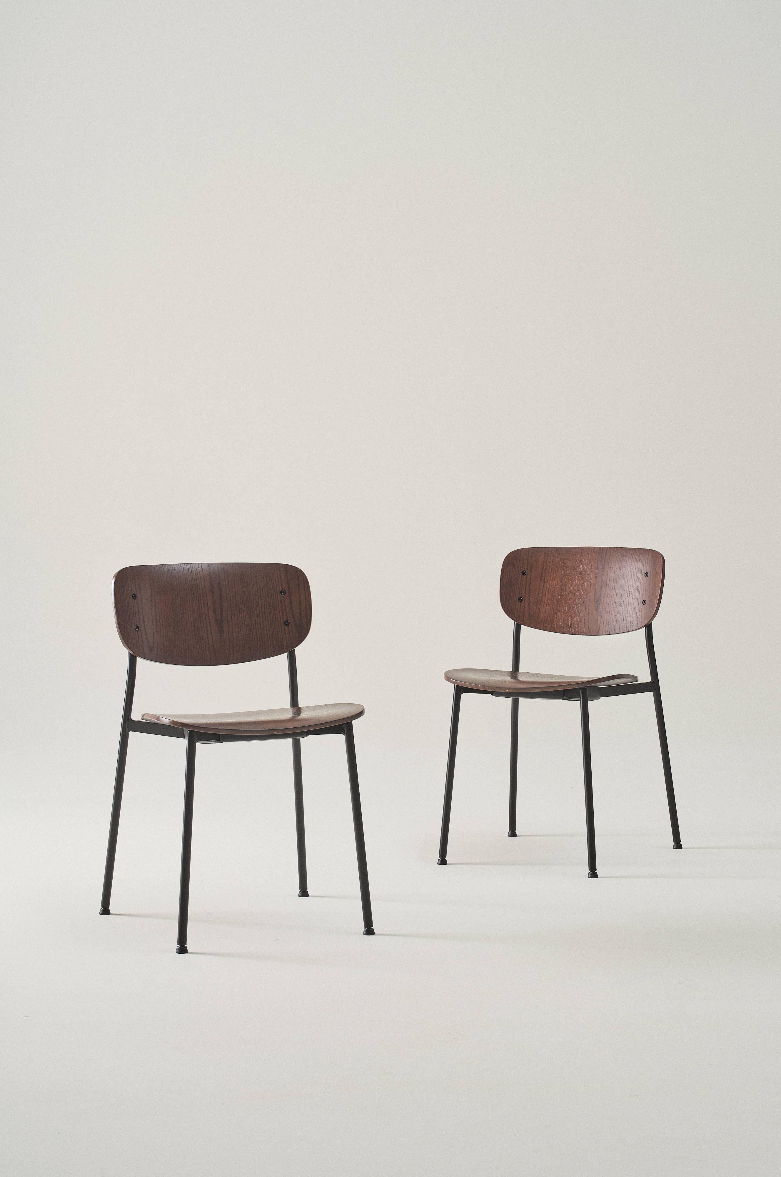 2 stylowe, klasyczne krzesła. Oparcie i siedzenie wykonano ze sklejki z certyfikatem FSC z okleiną dębową z certyfikatem FSC. Ramę wykonano z lakierowanej stali. Te praktyczne krzesła można ustawiać jedno na drugim. Wymaga częściowego montażu. Do produktu dołączona jest instrukcja montażu.