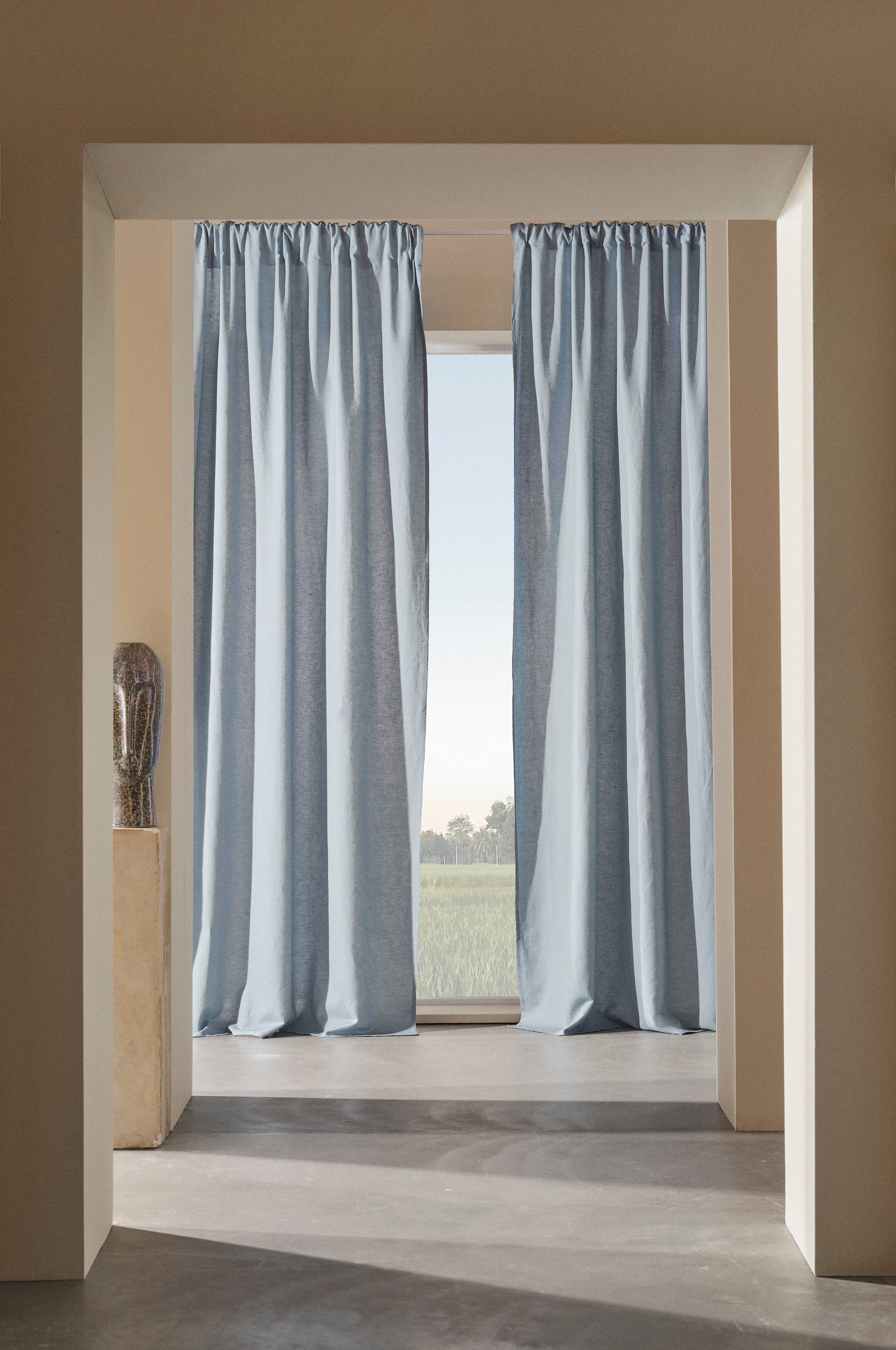 Dwie gładkie zasłony z mieszanki lnu i bawełny, dostępne w wielu naturalnych odcieniach. W prostocie kryje się piękno. Zasłony mają wszytą taśmę wielofunkcyjną, dzięki czemu można je zawiesić na haczykach lub przy użyciu tunelu czy krytych szelek. Mieszanka lnu i bawełny to piękna i łatwa w pielęgnacji tkanina, która posiada najlepsze cechy lnu i bawełny. Odrobinę sztywniejsza struktura lnu w połączeniu z miękką bawełną tworzy tkaninę, która jest zarówno zwiewna, jak i pięknie się układa.