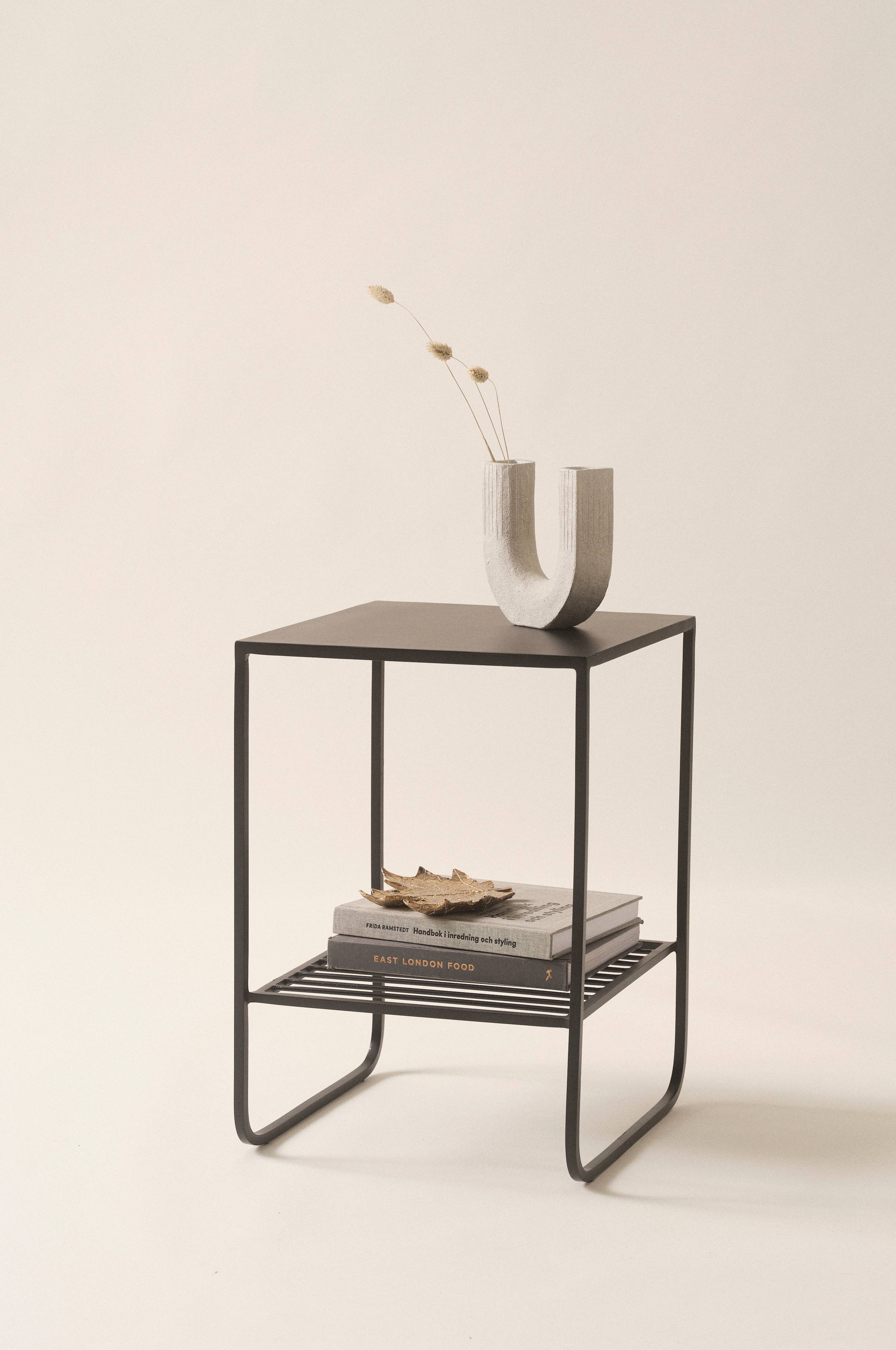 Stolik z żelaza o powierzchni pomalowanej matowym lakierem. Stolik jest wyposażony pod spodem w półkę, która umożliwia praktyczne przechowywanie. Sprawdza się doskonale obok sofy w salonie, ale to też wspaniały stolik nocny. Stelaż został wykonany z profili czworokątnych, a ozdobne nogi zaokrąglają się, tak że stolik stoi jak na płozach.
