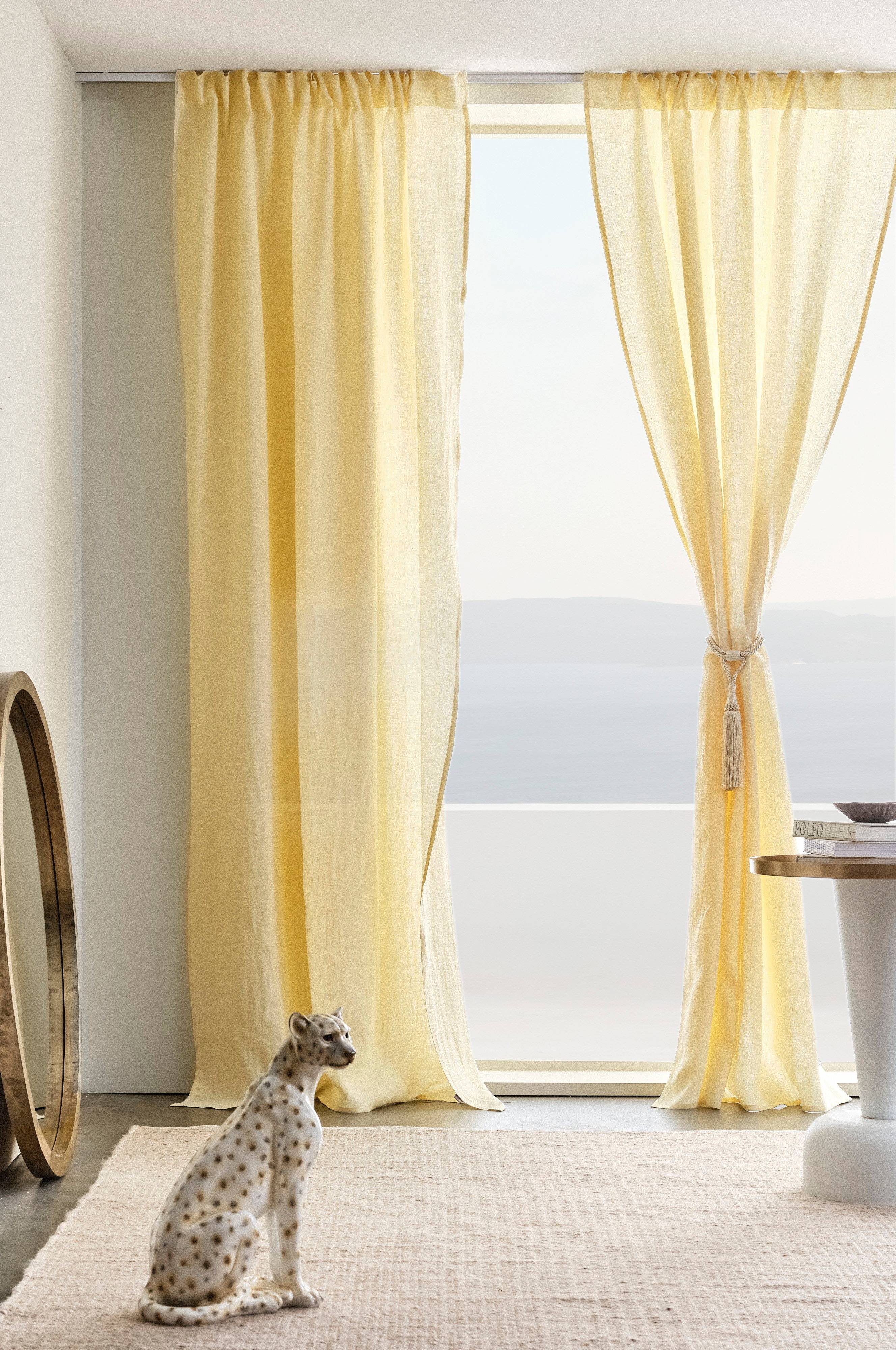 Dwie zasłony z 100% lnu z wszytą taśmą wielofunkcyjną. Zasłony można zawiesić na haczykach lub przy użyciu tunelu czy krytych szelek. Len ze względu na swoją specyficzną strukturę to tkanina charakteryzująca się rustykalnym i naturalnym wyglądem, jest piękna, a jasne odcienie pogłębiają jej prostotę.