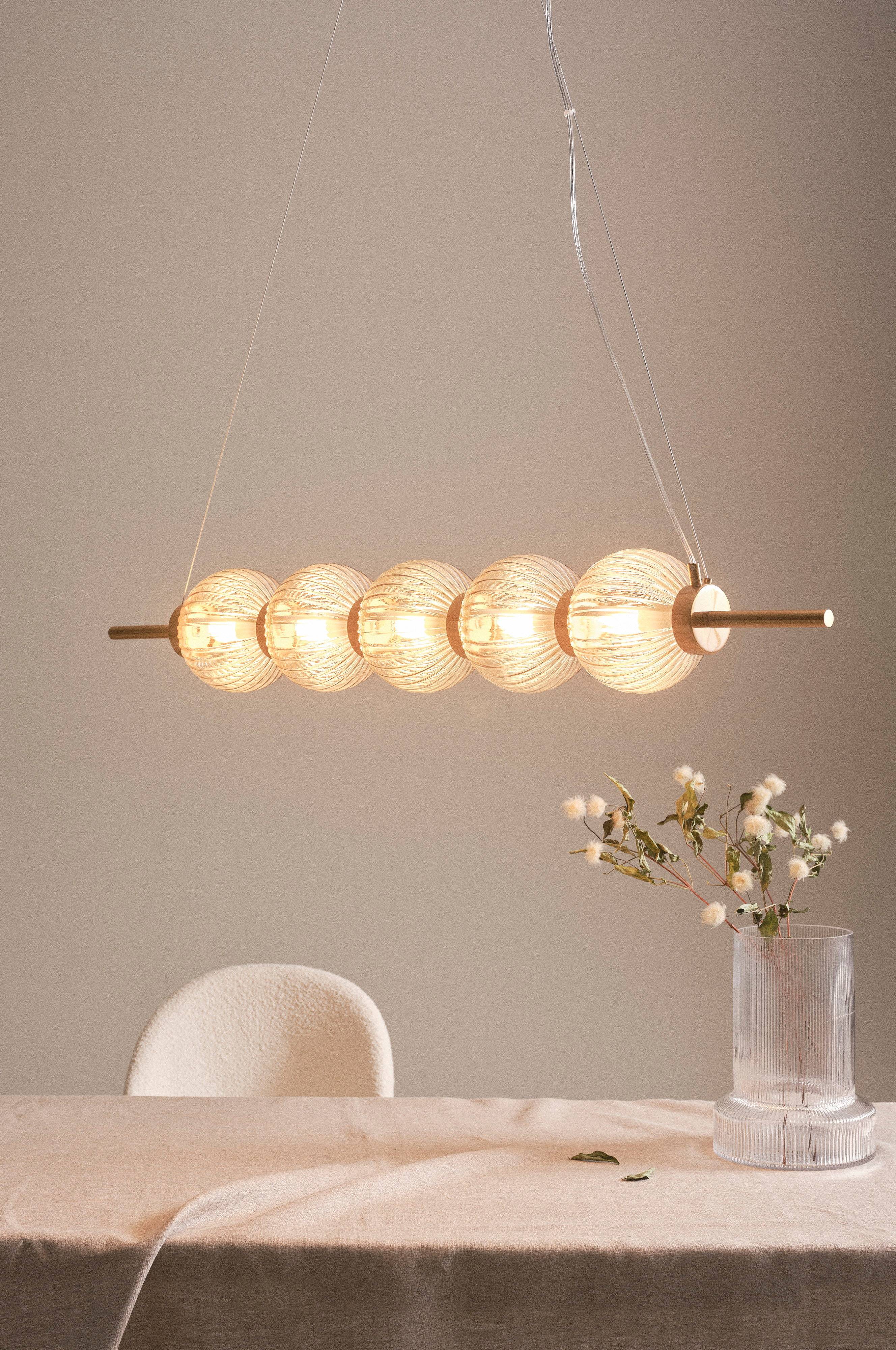 Lampa sufitowa z metalu w kolorze mosiądzu z ustawionymi w jednej linii pięcioma zaokrąglonymi kloszami z barwionego szkła. ON A ROLL to nowoczesna i ekscytująca lampa sufitowa, która roztoczy blask nad stołem w jadalni lub równie elegancko zabłyśnie nad stolikiem do kawy lub nad ławą. Lampa jest uziemiona, klasa 1. Ze względu na regulacje unijne, w niektórych krajach wymagany jest dodatkowy przełącznik sufitowy. Przełącznik sufitowy powinien być uziemiony (klasa 1) i kupiony oddzielnie.