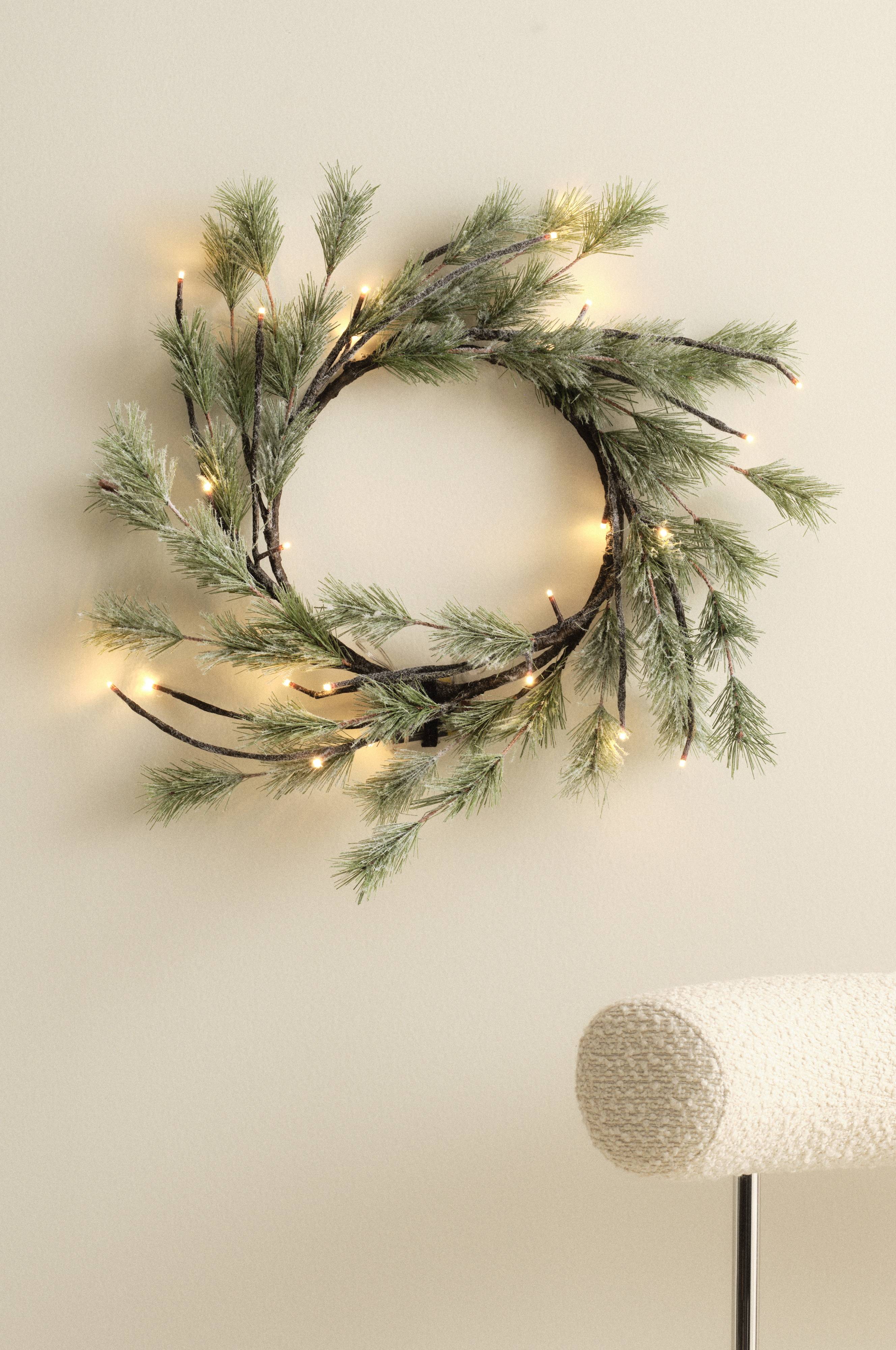 Wspaniały wieniec dekoracyjny z niewielkimi lampkami, do użytku we wnętrzach. Papierowy wieniec ozdobiony jest 24 żarówkami LED o ciepłym, białym świetle. Wieniec jest zasilany bateriami i ma cykliczny timer, dzięki któremu lampki świecą 6 godzin, a następnie wyłączają się na 18 godzin. Zasilanie: 3 baterie AA. Baterie sprzedawane osobno.
