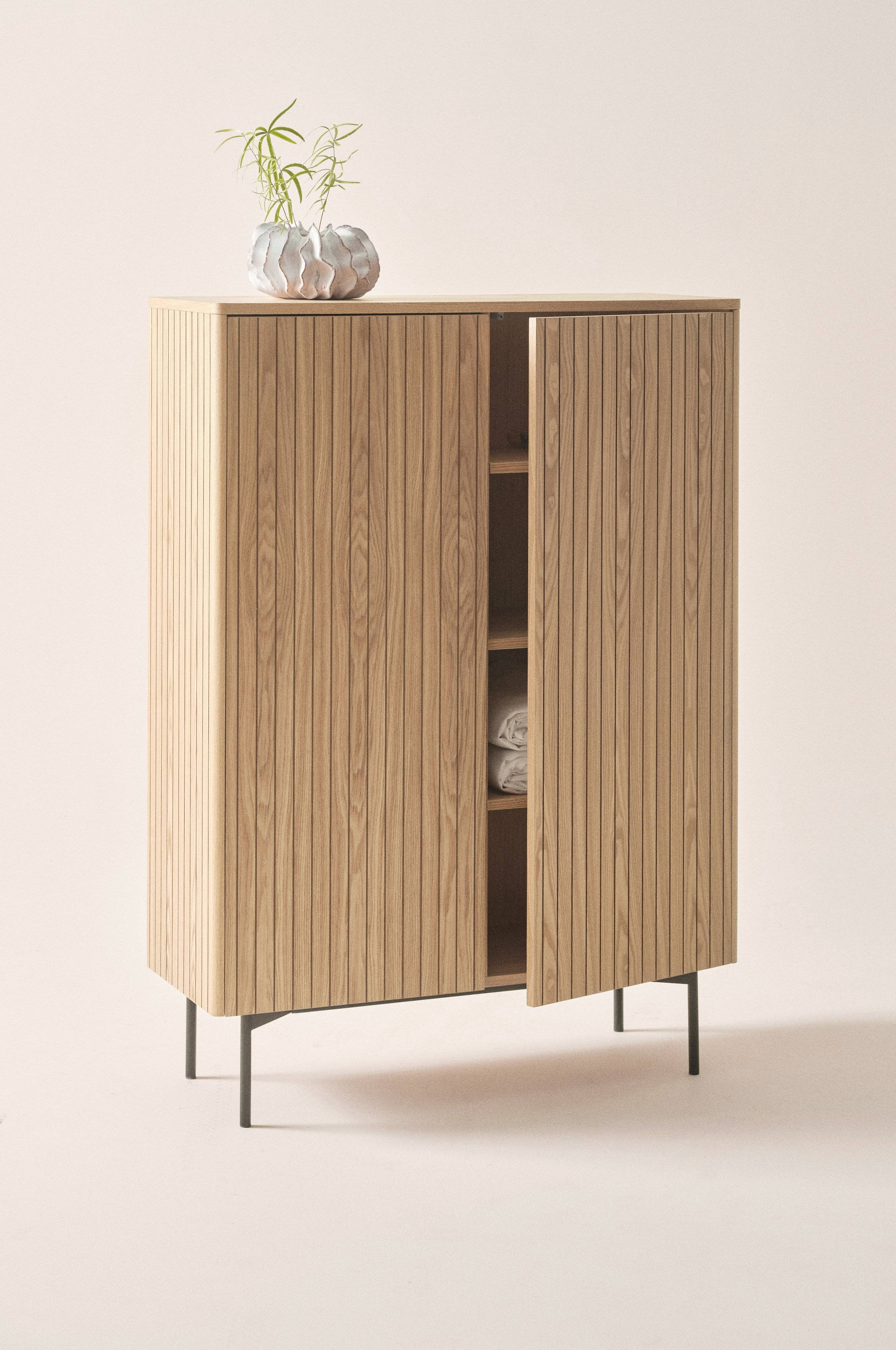 Szafka wykonana z płyty MDF z jesionową okleiną. Szafka posiada wyfrezowane, pionowe paski, które nadają jej klasyczny charakter retro. Stylowa szafka ma delikatnie zaokrąglone narożniki oraz drzwiczki z funkcją push - aby otwierać i zamykać drzwiczki wystarczy je delikatnie przycisnąć. W szafce znajdują się trzy nieregulowane półki. Proste, stalowe nóżki zostały pomalowane proszkowo. PALANZO to stylowa szafka, która nada Twojemu pokojowi charakteru, zapewniając jednocześnie skryte za drzwiczkami, praktyczne miejsce do przechowywania. Mocowanie do ściany w zestawie. Śruby w zestawie. Wymaga częściowego montażu. Do produktu dołączona jest instrukcja montażu.