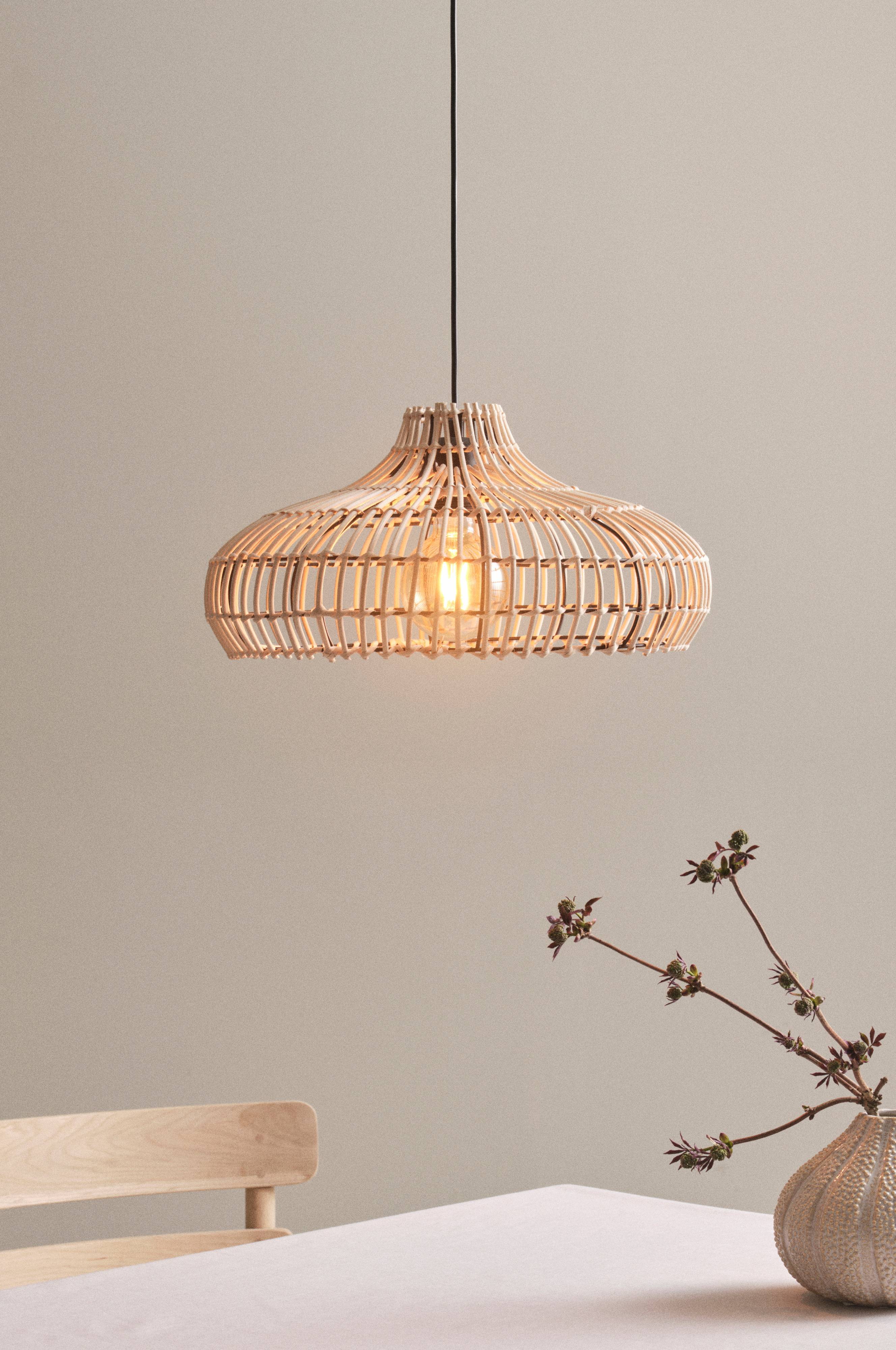 Lampa sufitowa z rzadko plecionego, naturalnego rattanu, przez którego dekoracyjny oplot widać żarówkę. Puszka sufitowa PALU jest wykonana z matowoczarnego metalu, z którego wykonano także hak do zawieszania. PALU roztacza przytulny blask oraz tworzy naturalną, nieco artystyczną atmosferę. Czarny plastikowy przewód, którego długość można regulować tak, aby lampa wisiała na odpowiedniej wysokości na przykład nad kuchennym stołem. Lampa jest uziemiona, klasa 1. Ze względu na regulacje unijne, w niektórych krajach wymagany jest dodatkowy przełącznik sufitowy. Przełącznik sufitowy powinien być uziemiony (klasa 1) i kupiony oddzielnie.