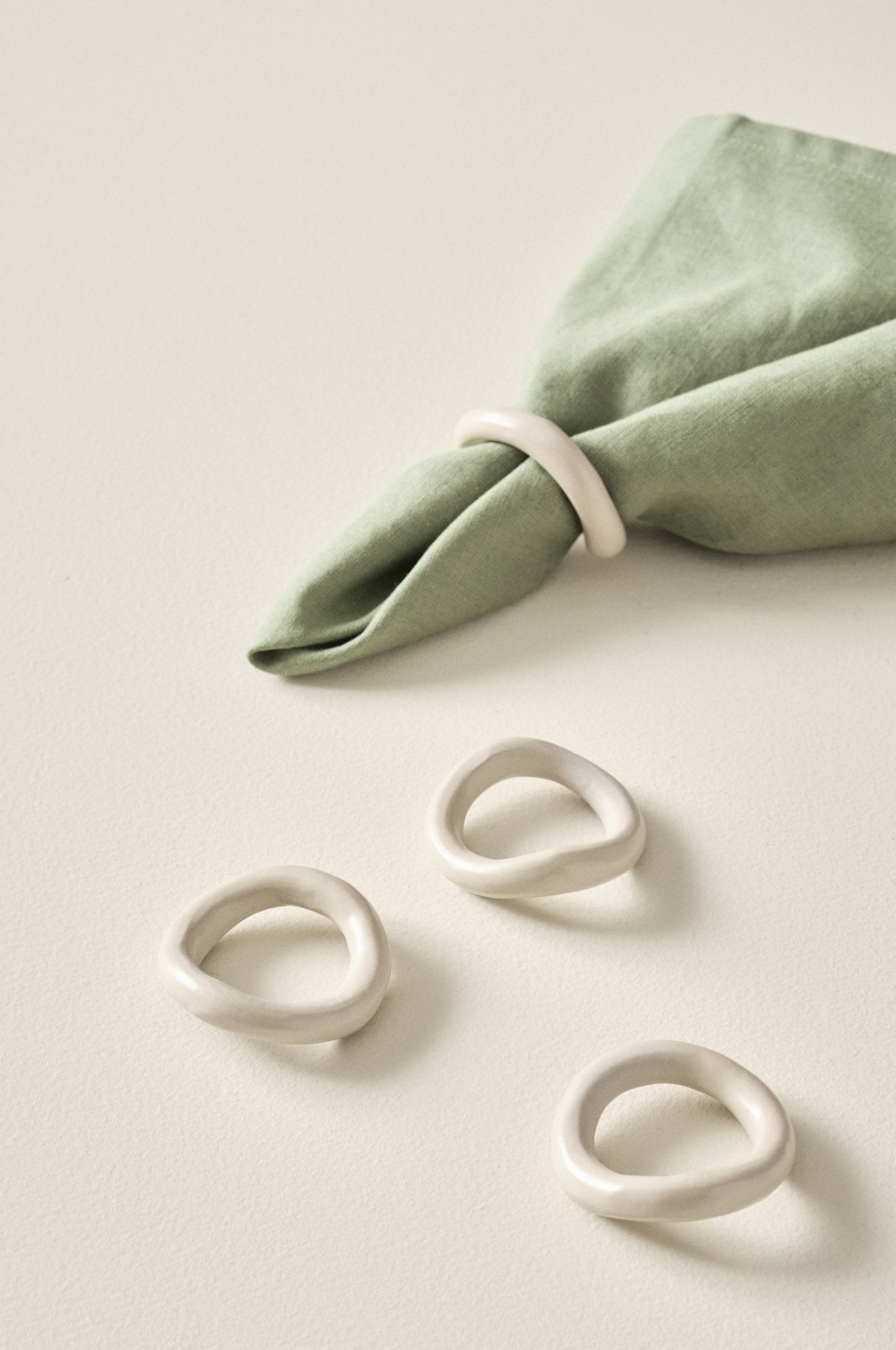 4 obrączki do serwetek wykonane z aluminium. Obrączki o naturalnym, nieregularnym kształcie otaczające materiałowe serwetki nadadzą przytulny wygląd całemu nakryciu. Obrączki zostały pomalowane metodą proszkową i a ich powierzchnia ma matowe wykończenie.