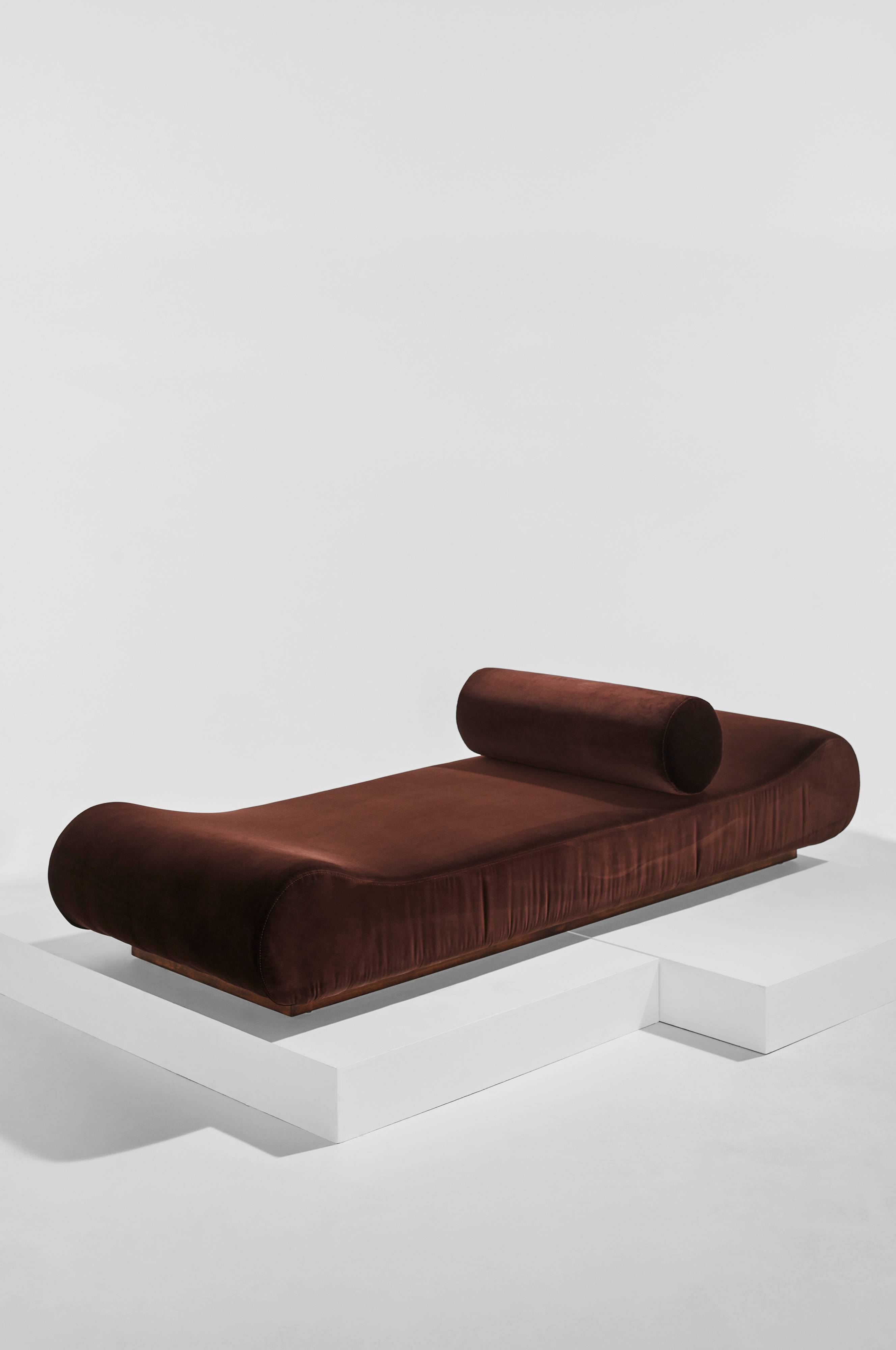 Leżanka pokryta aksamitem ma podstawę wykonaną z litej sosny. Wgłębiona podstawa sprawia wrażenie, jakby całość unosiła się w powietrzu. Do leżanki dołączona jest poduszka w kształcie wałka. Gładki, miękki aksamit mieni się różnymi odcieniami, w zależności od tego, jak pada na niego światło. Wszystkie elementy drewniane Fay mają certyfikat FSC. Rama została wykonana z sośniny i sklejki. Sprężyny faliste, elastyczna taśma i zimna pianka sprawiają, że sofa jest cudownie wygodna i pozwala na chwilę wyciszenia. Faye ma w sobie cudowną nutę retro, dzięki której roztacza wokół aurę lat 70. i nostalgii.