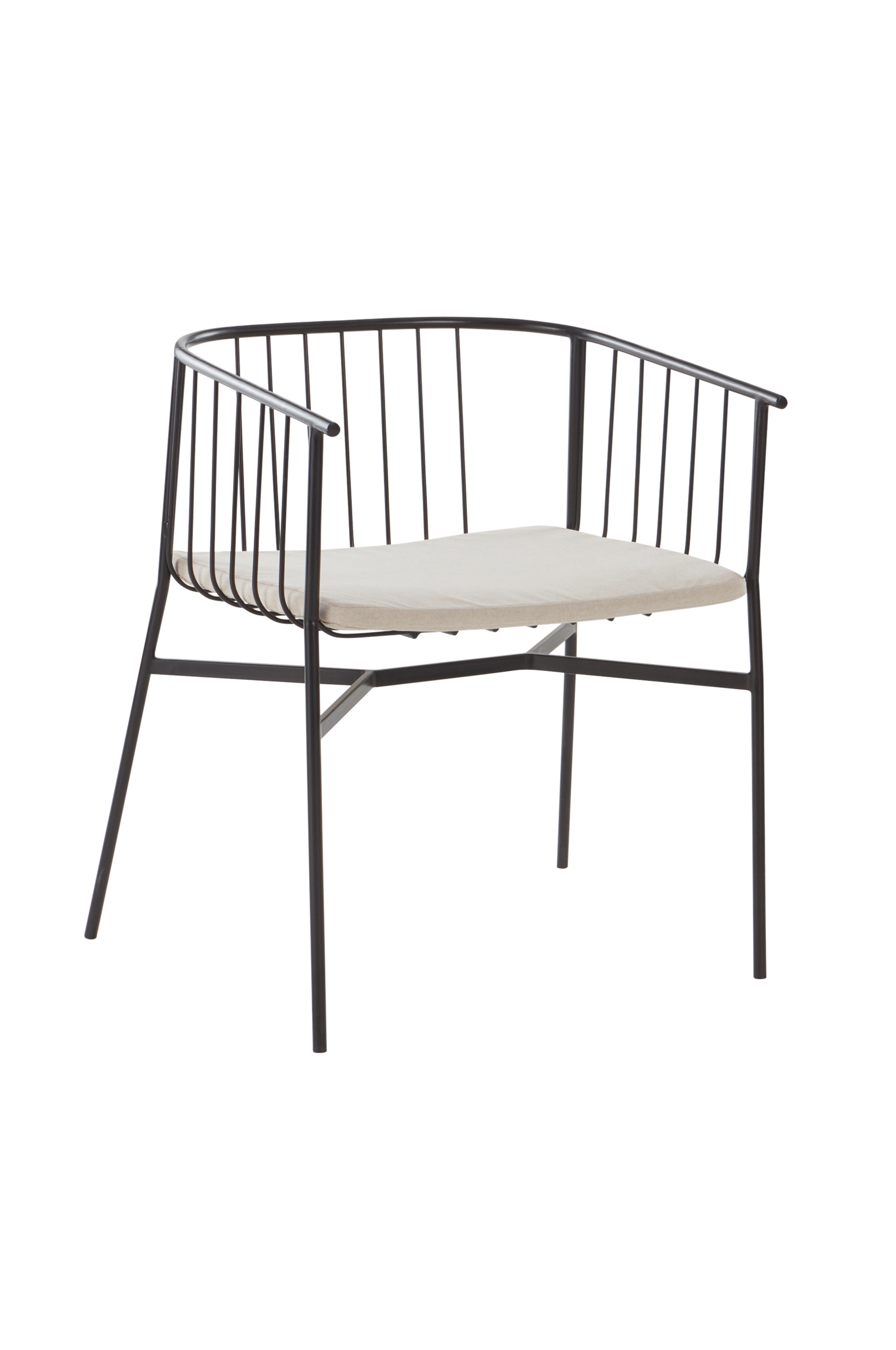 Krzesło z podłokietnikami wykonane z lakierowanego proszkowo żelaza. Krzesło ma wąskie, okrągłe żeberka w oparciu i podłokietnikach, a całość tworzy wygodny i dekoracyjny mebel w praktycznym formacie. W pojedynkę, PERISSA będzie pięknie wyglądać w holu, sypialni lub salonie. Poducha ma pokrycie z płótna bawełnianego i miękkie wypełnienie. Poducha mocowana jest na cztery rzepy, dzięki czemu pozostaje na miejscu. Pokrycie nie jest zdejmowane.