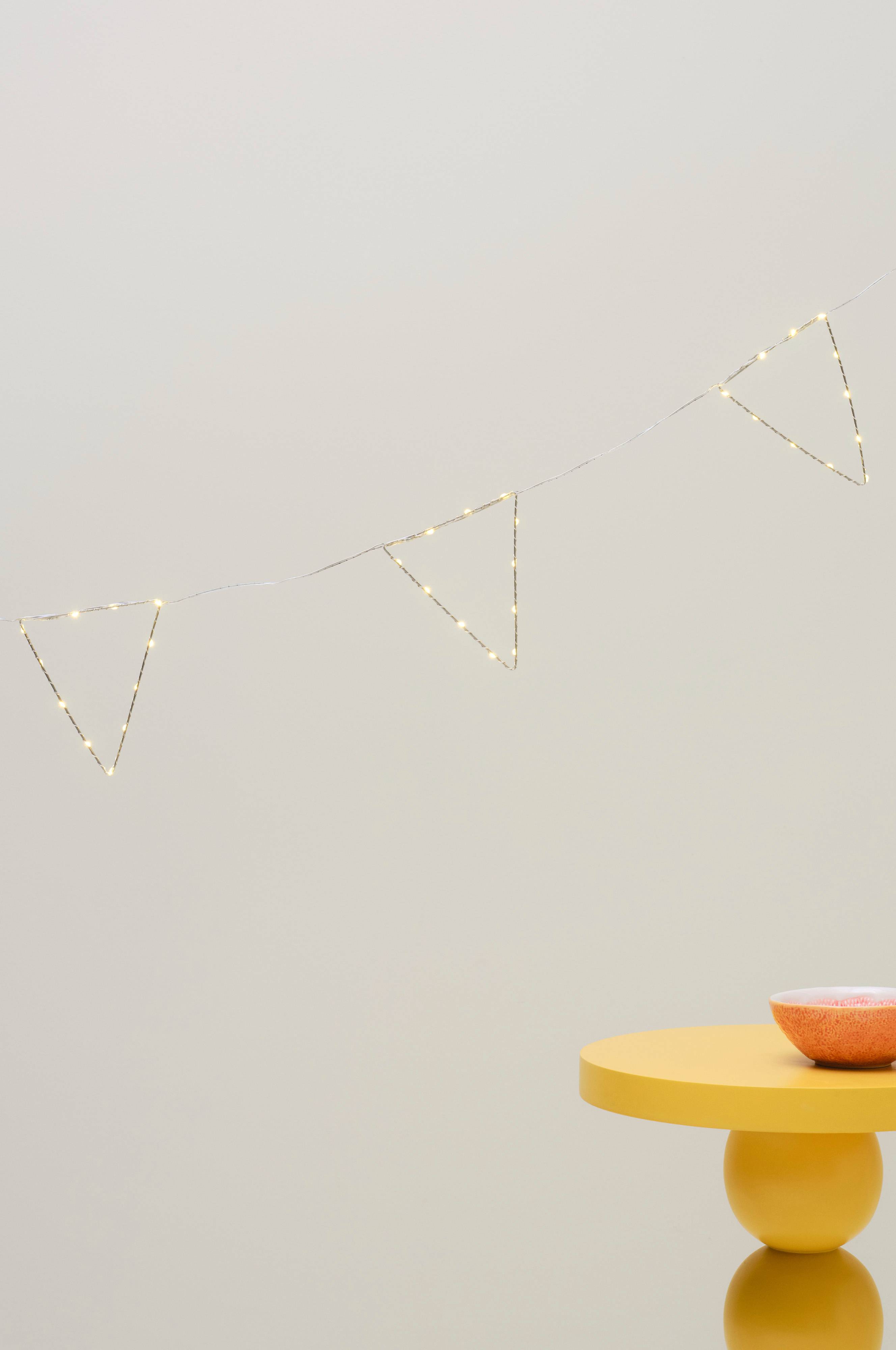 Dekoracyjny łańcuch świetlny z metalowymi proporczykami w kolorze srebrnym. Każdy proporzec ma łańcuch świetlny z kroplą rosy z 11 ciepłobiałymi diodami LED owiniętymi wokół ramy. Pojemnik na baterie do użytku na zewnątrz z funkcją timera. Idealny zarówno na co dzień, jak i na imprezy.