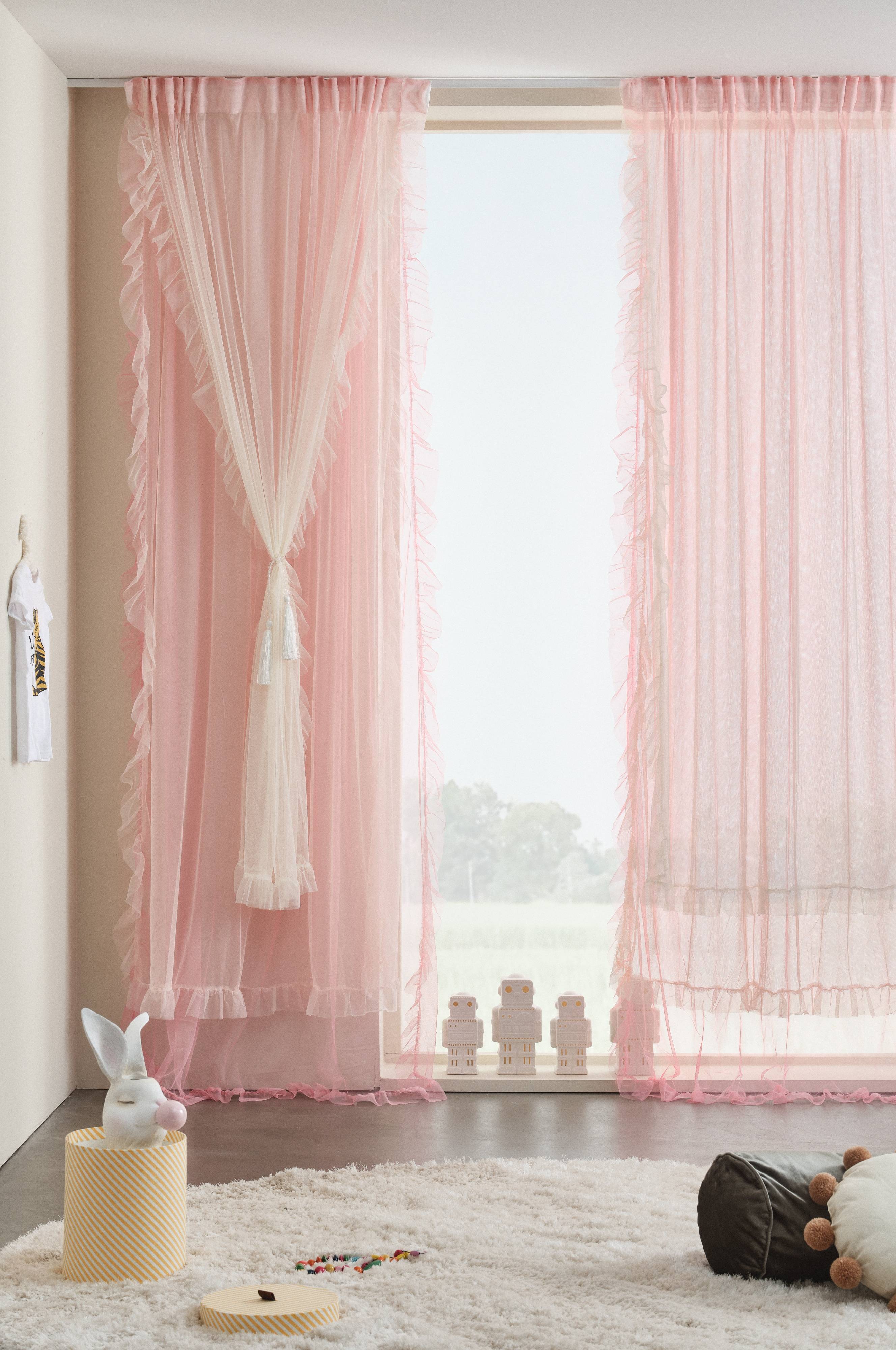 Dwie zasłony z przewiewnego, przejrzystego poliestru wykończone po bokach falbaną. Każda zasłona składa się z dwóch warstw materiału o różnych odcieniach. Dzięki temu rozwiązaniu zasłony sprawiają wrażenie lekkich i przewiewnych tworząc zarazem wspaniały efekt w pomieszczeniu. W górnej części zasłon wszyta jest taśma wielofunkcyjna. Zasłonę można zawiesić na haczykach lub przy użyciu tunelu czy krytych szelek.