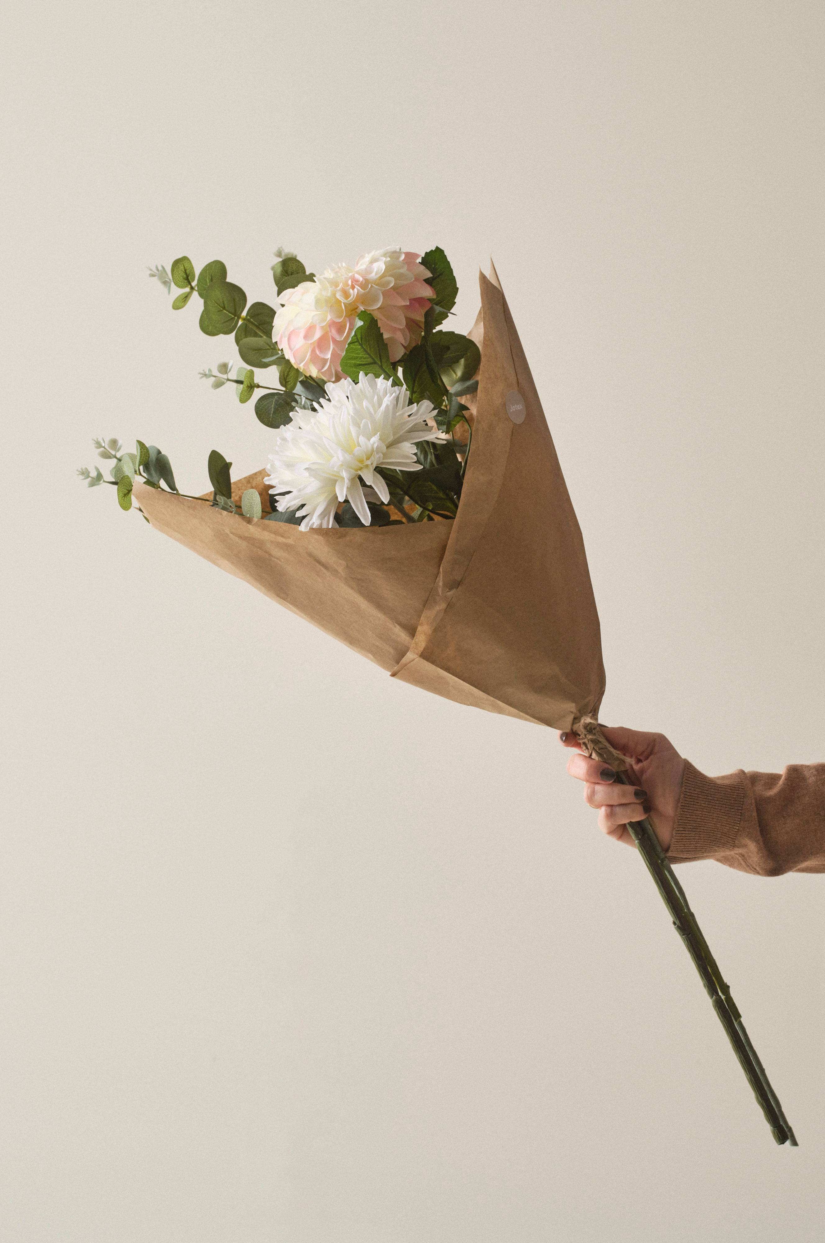 Sztuczny bukiet dalii, hortensji i eukaliptusa, każdy bukiet jest wiązany ręcznie. Bukiet wygląda niezwykle naturalnie i w 80% został wykonany z poliestru pochodzącego z recyklingu. Bukiet jest zawinięty w bibułę. Artystycznie ułożony bukiet będzie cieszyć oko przez długi czas i nigdy nie zwiędnie.