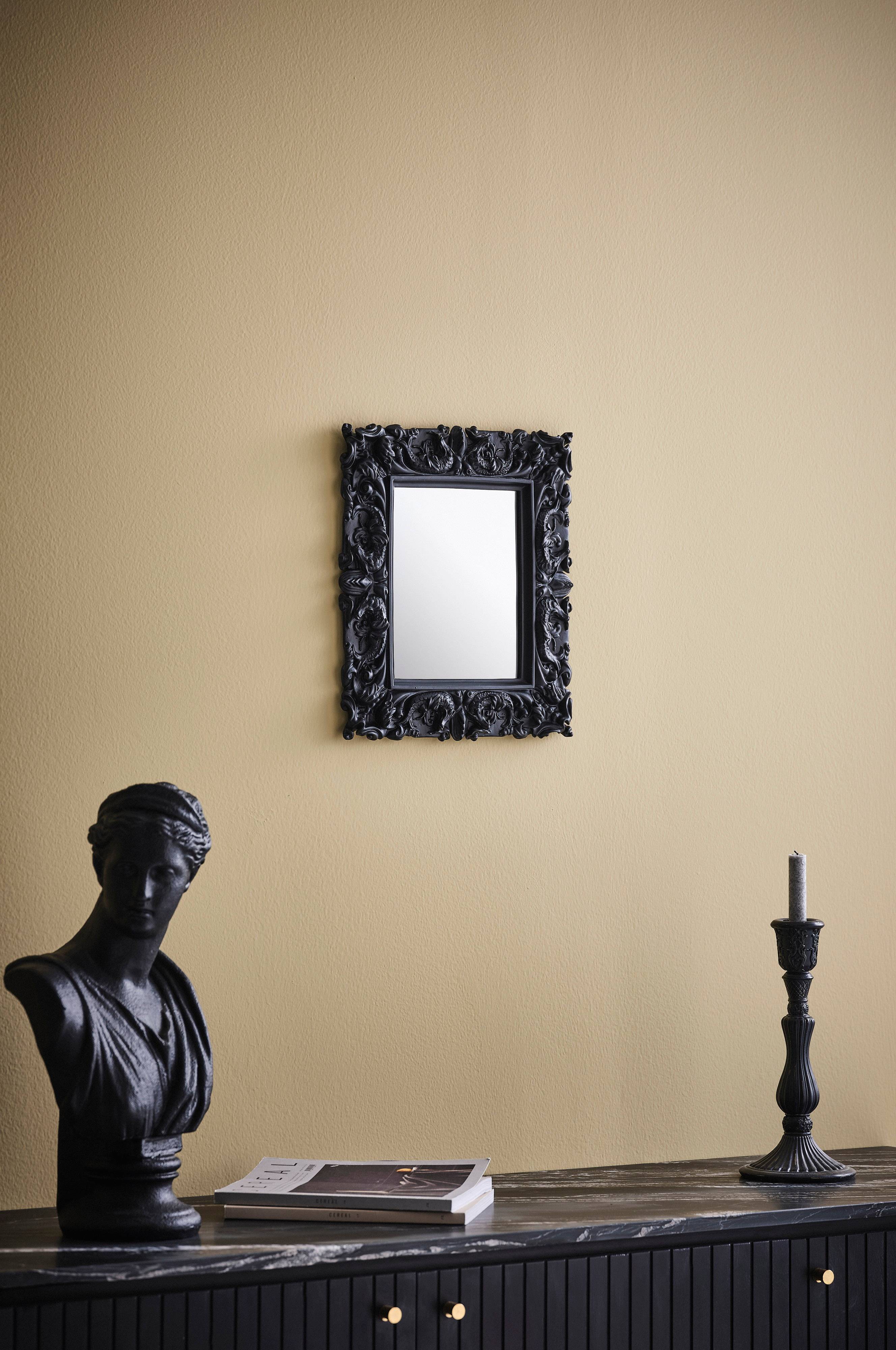 Pięknie zdobione lustro z szeroką ramą z żywicy epoksydowej z antycznym wykończeniem stanie się ozdobą każdego pomieszczenia.