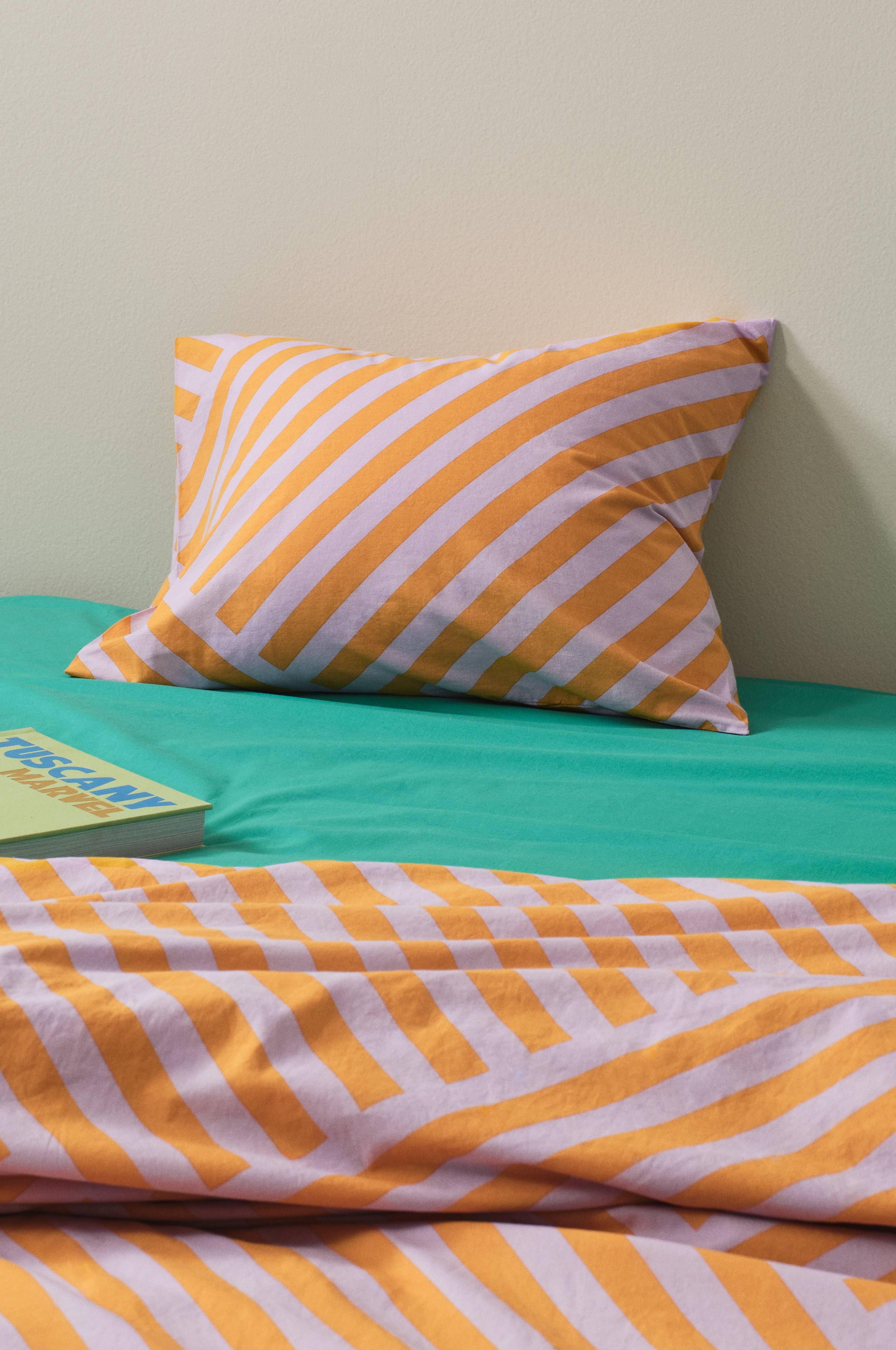 Poszewka z bawełny z nadrukowanym geometrycznym wzorem pasków. Seria pościeli RIMA została poddana praniu przemysłowemu, dzięki czemu zyskała na miękkości i wyglądzie. Gęstość splotu materiału wynosi 144 TC. (Gęstość splotu materiału oznacza ilość przeplecionych ze sobą nici, thread count, na cal kwadratowy materiału. Im wyższa gęstość tym lepsza jakość.)