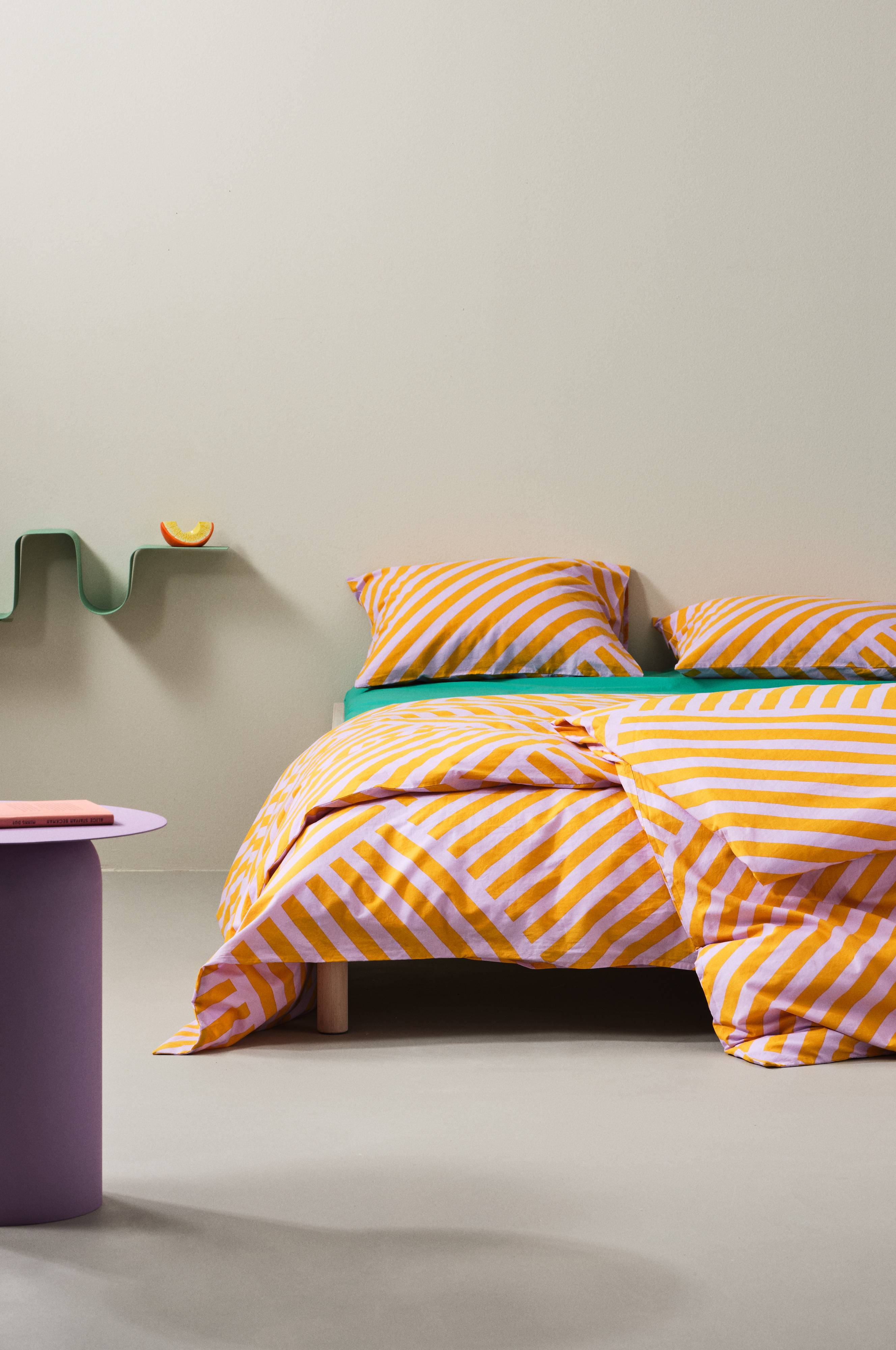 Bawełniana poszwa ze wzorzystym nadrukiem w geometryczne pasy. Seria pościeli RIMA została poddana praniu przemysłowemu, dzięki czemu zyskała na miękkości i wyglądzie. Poszwa posiada zapięcie na zatrzaski. Gęstość splotu materiału wynosi 144 TC. (Gęstość splotu materiału oznacza ilość przeplecionych ze sobą nici, thread count, na cal kwadratowy materiału. Im wyższa gęstość tym lepsza jakość.)