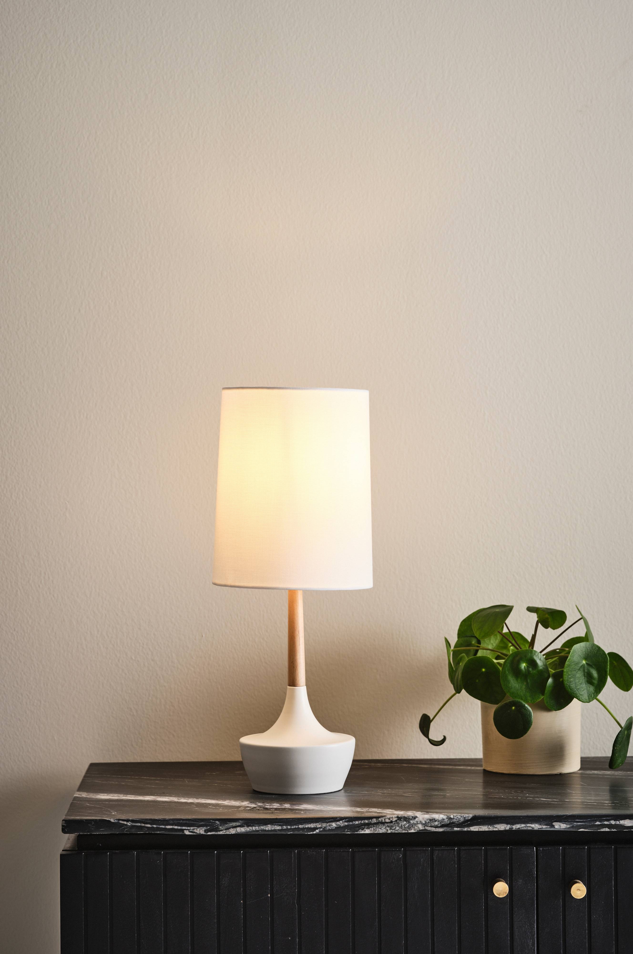 Lampa stołowa o prostym, lnianym kloszu ustawiona na stopce z metalu i drewna. Stopka i klosz tworzą popularną obecnie, kontrastową kompozycję, której efektem jest stylowa lampa, która rozświetli Twój dom. Czarny plastikowy przewód z wyłącznikiem.