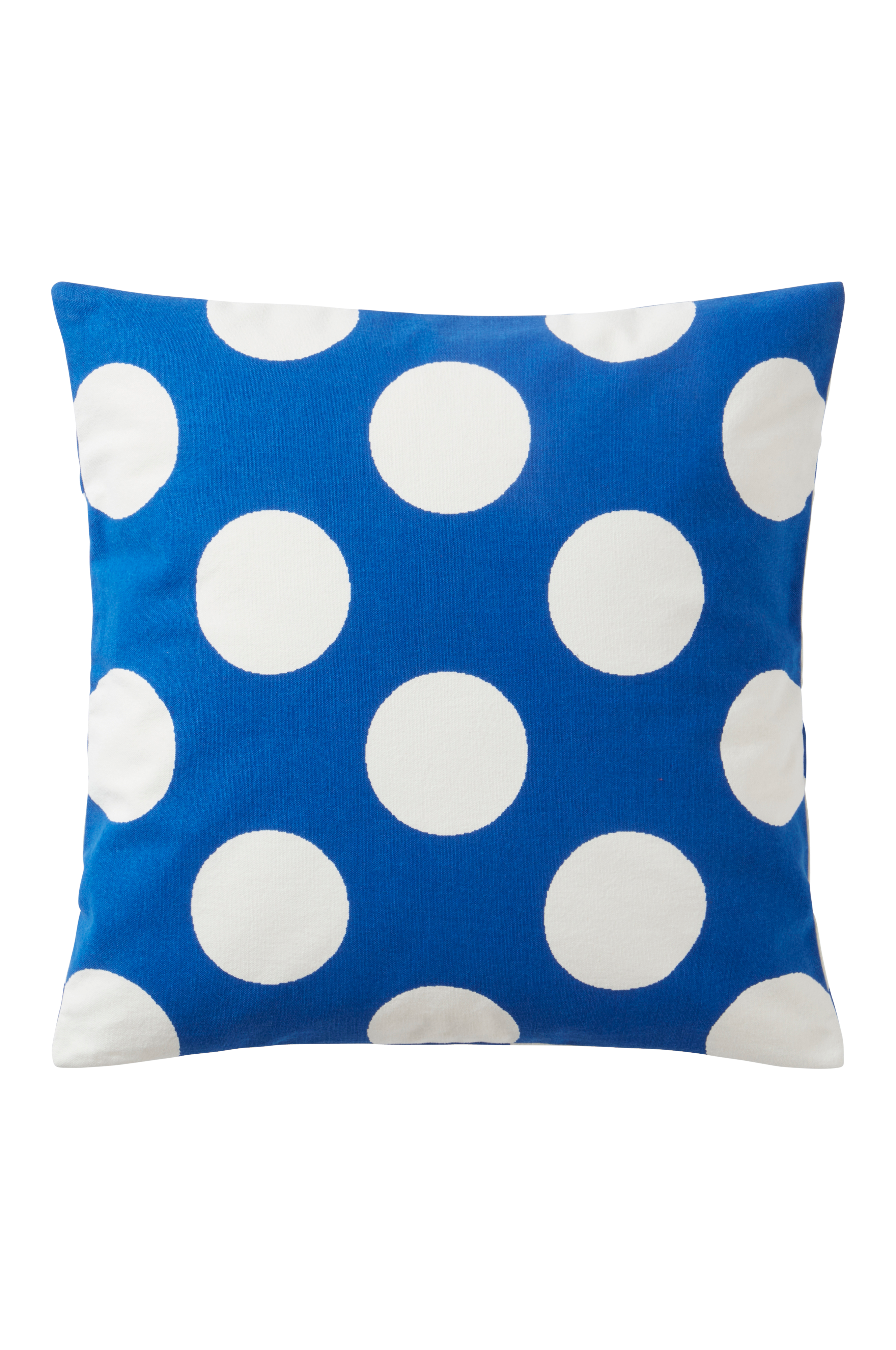 Poszewka dekoracyjna z nieco grubszej tkaniny bawełnianej ze wzorem dużych kropek. Odcienie są czyste, wyraźne i wspaniale komponują się z bielą. Przód i tył mają odwrócone kolory, więc z jednej strony poduszki umieszczono białe kropki na kolorowym tle, a na drugiej stronie znajdują się kolorowe kropki na białym tle. Poszewka ma w sobie nutę retro i będzie stanowić elegancki akcent. Zamek błyskawiczny w spodniej krawędzi. Gramatura tkaniny 240 g/m².