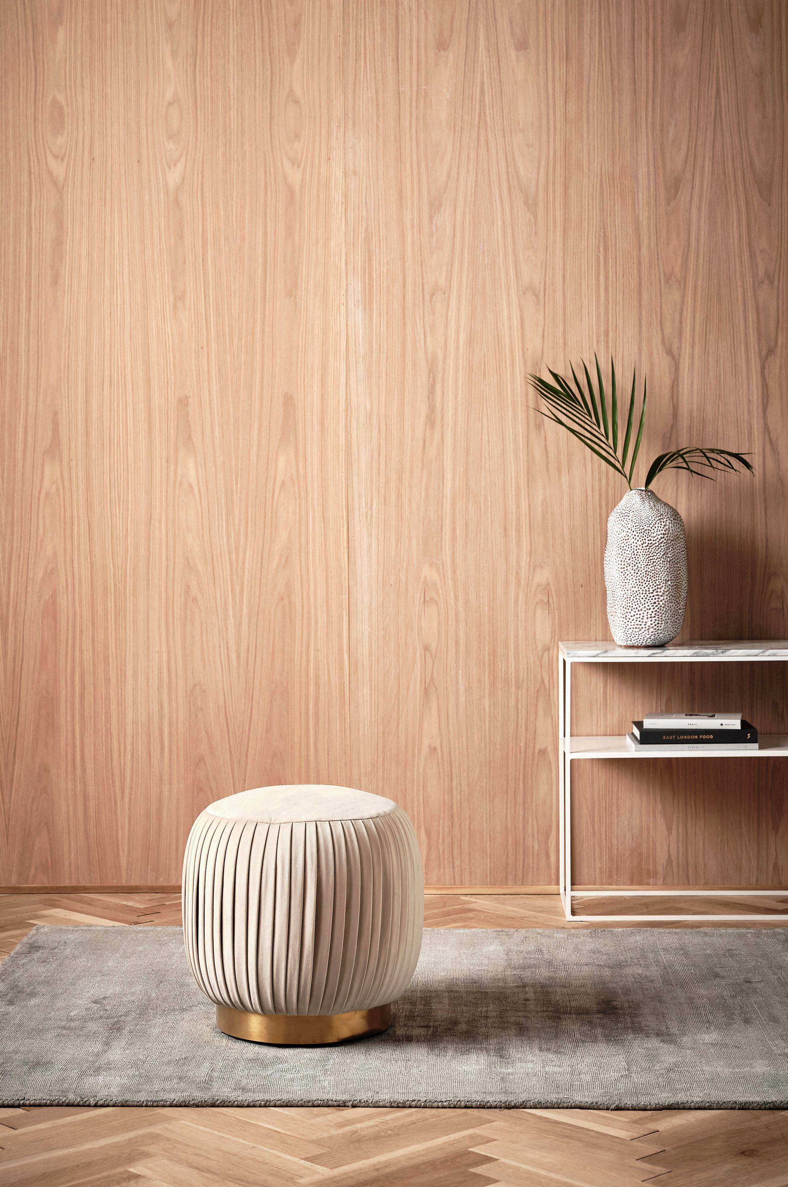 Puf z niezdejmowanym pokryciem i z dekoracyjną obręczą z mosiądzu. Stwórz przytulny i kolorowy akcent w pokoju za pomocą naszego zgrabnego pufa z aksamitu z mosiężnymi detalami.