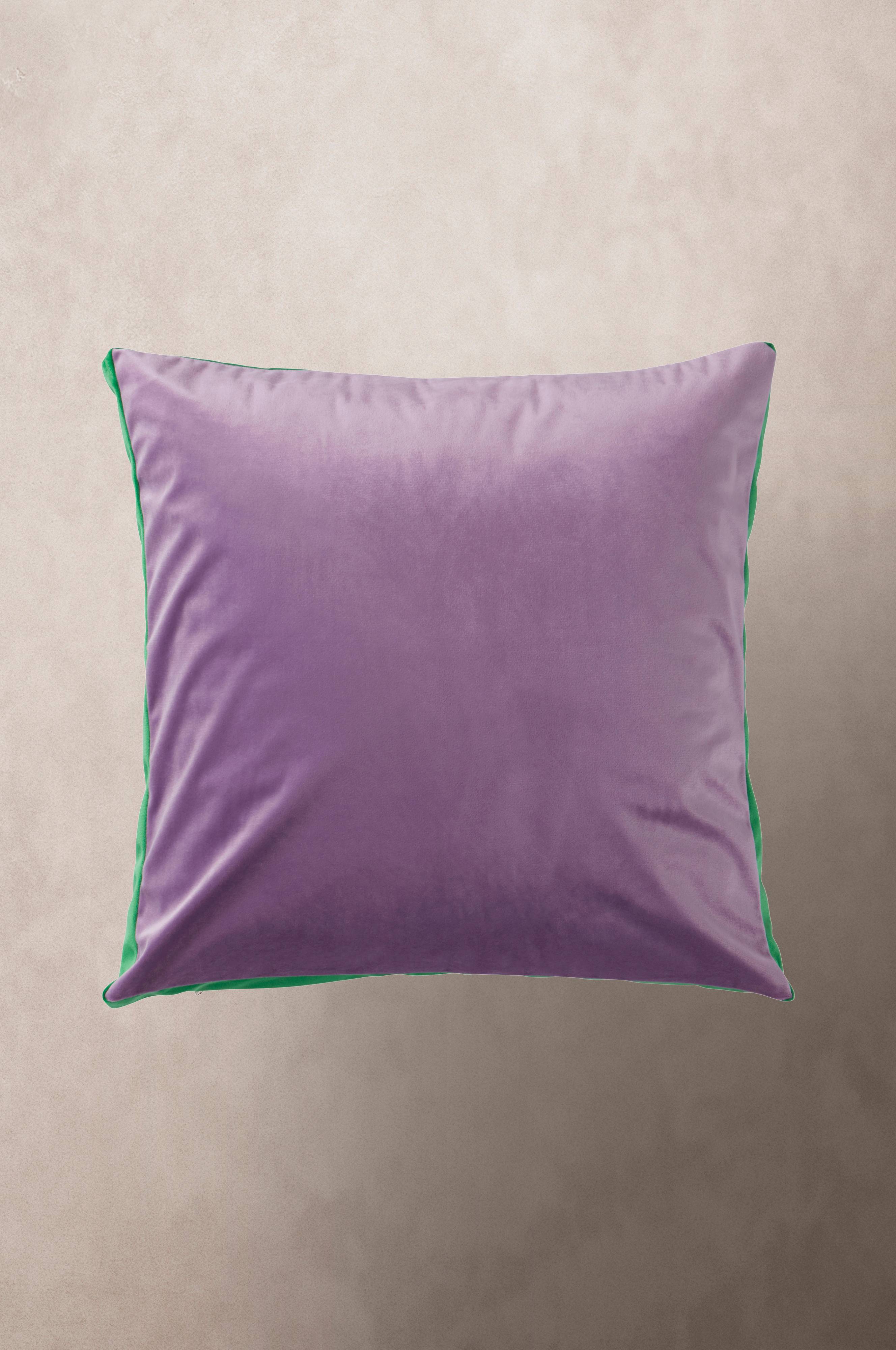 Poszewka na poduszkę wykonana z gładkiego, poliestrowego aksamitu, który w połowie pochodzi z recyklingu. Wokół poszewki biegnie lamówka w kontrastującym odcieniu. Połyskliwy aksamit jest miękki w dotyku i mieni się różnymi odcieniami w zależności od kąta padania światła. W dolnej krawędzi wzdłuż lamówki poszewka ma ukryty zamek błyskawiczny. Gramatura tkaniny 210 g/m².